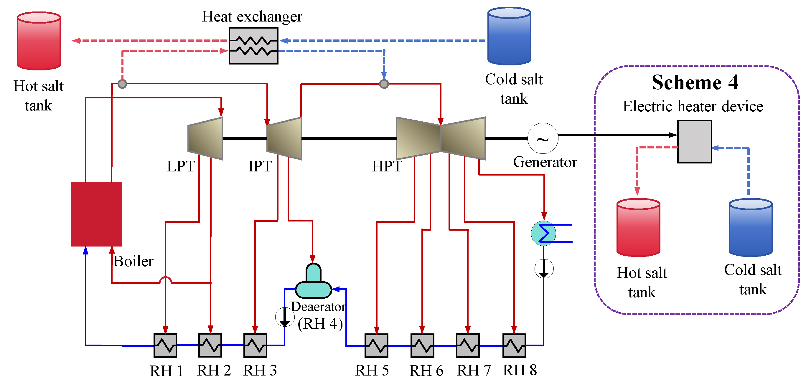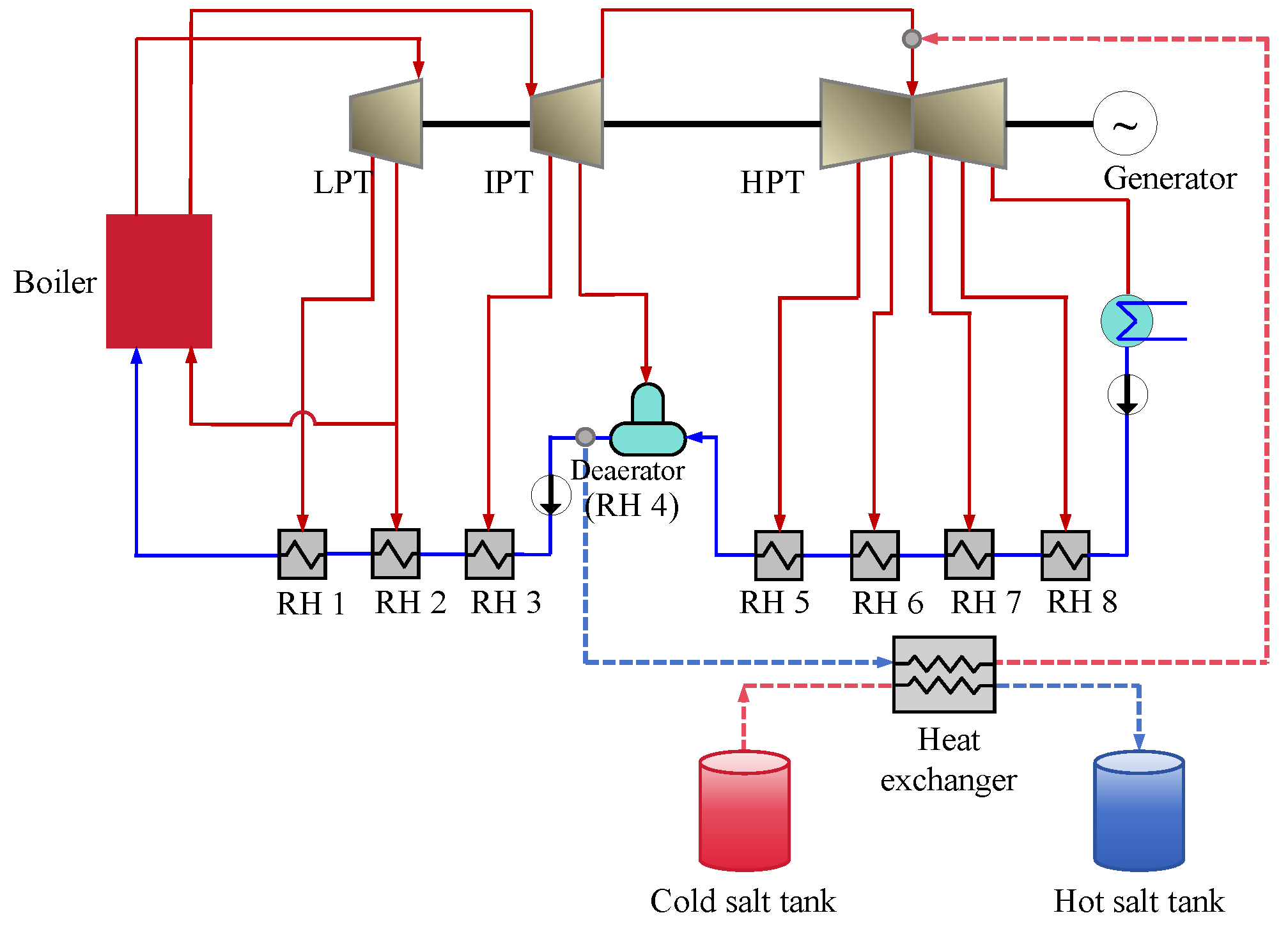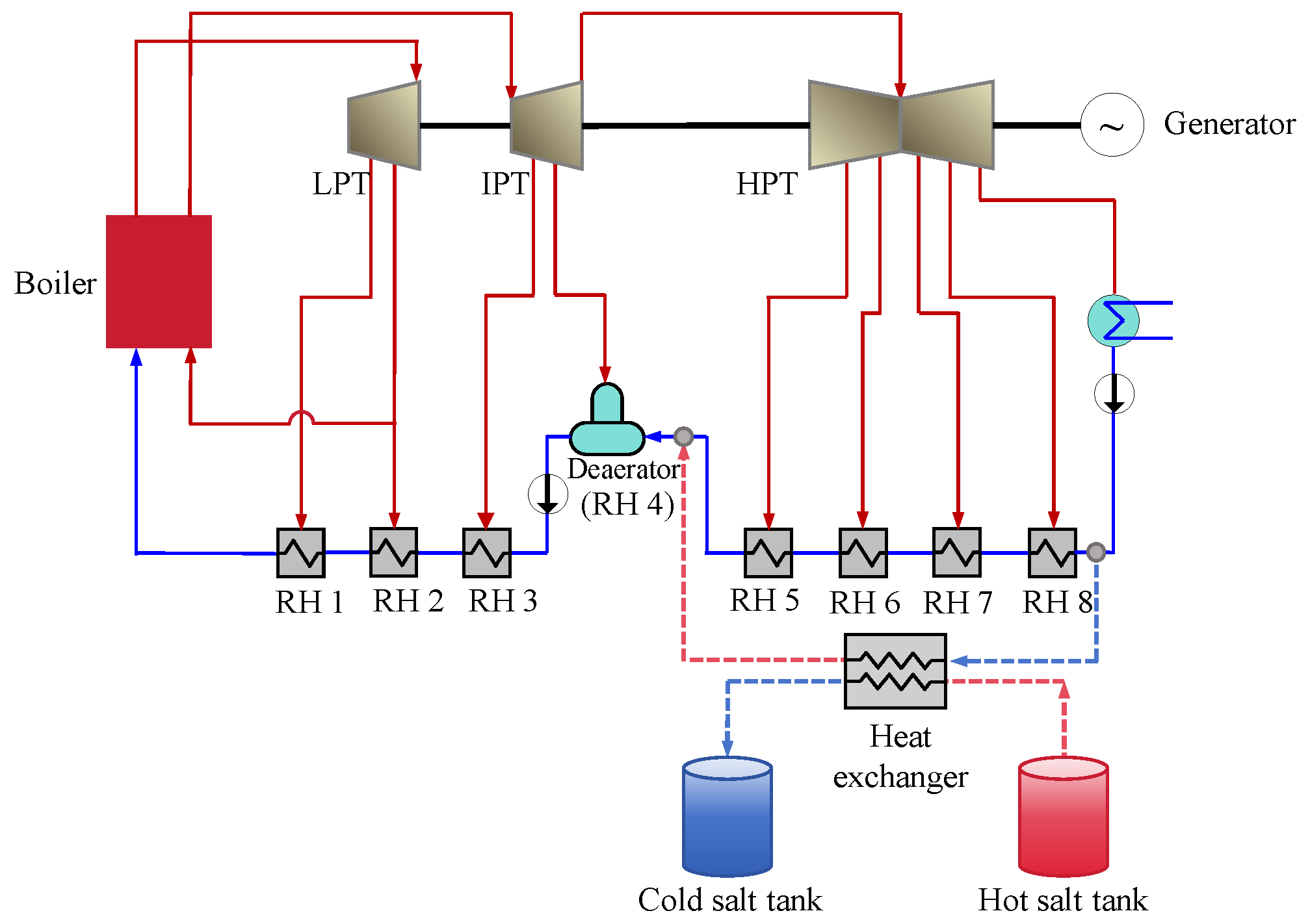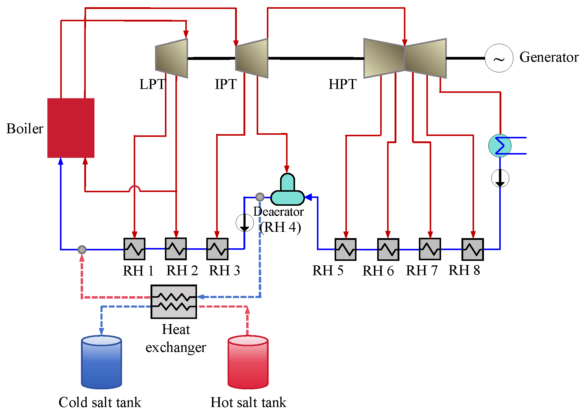21. Zhang, Z.; Chen, G.; Zhou, X.; Jiang, Y. Scheme design and performance analysis for a 670 MW coal-fired unit coupled with molten salt energy storage system. Therm. Power Gener. 2024, 53, 89–98. [Google Scholar] [CrossRef]