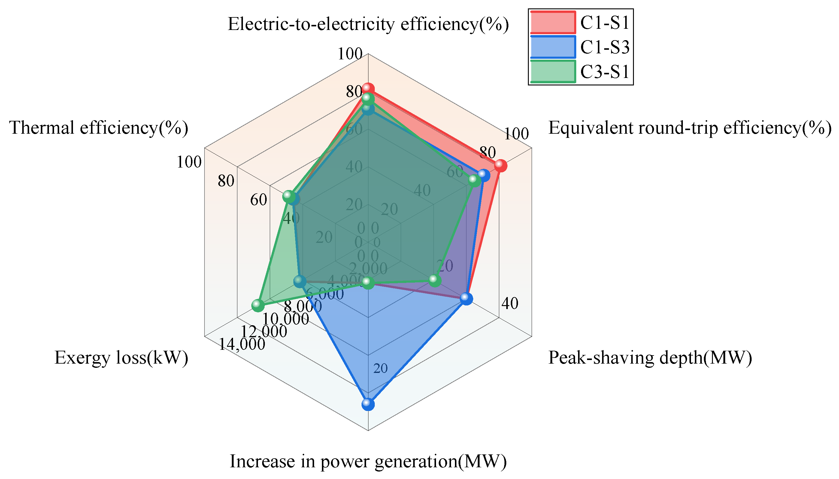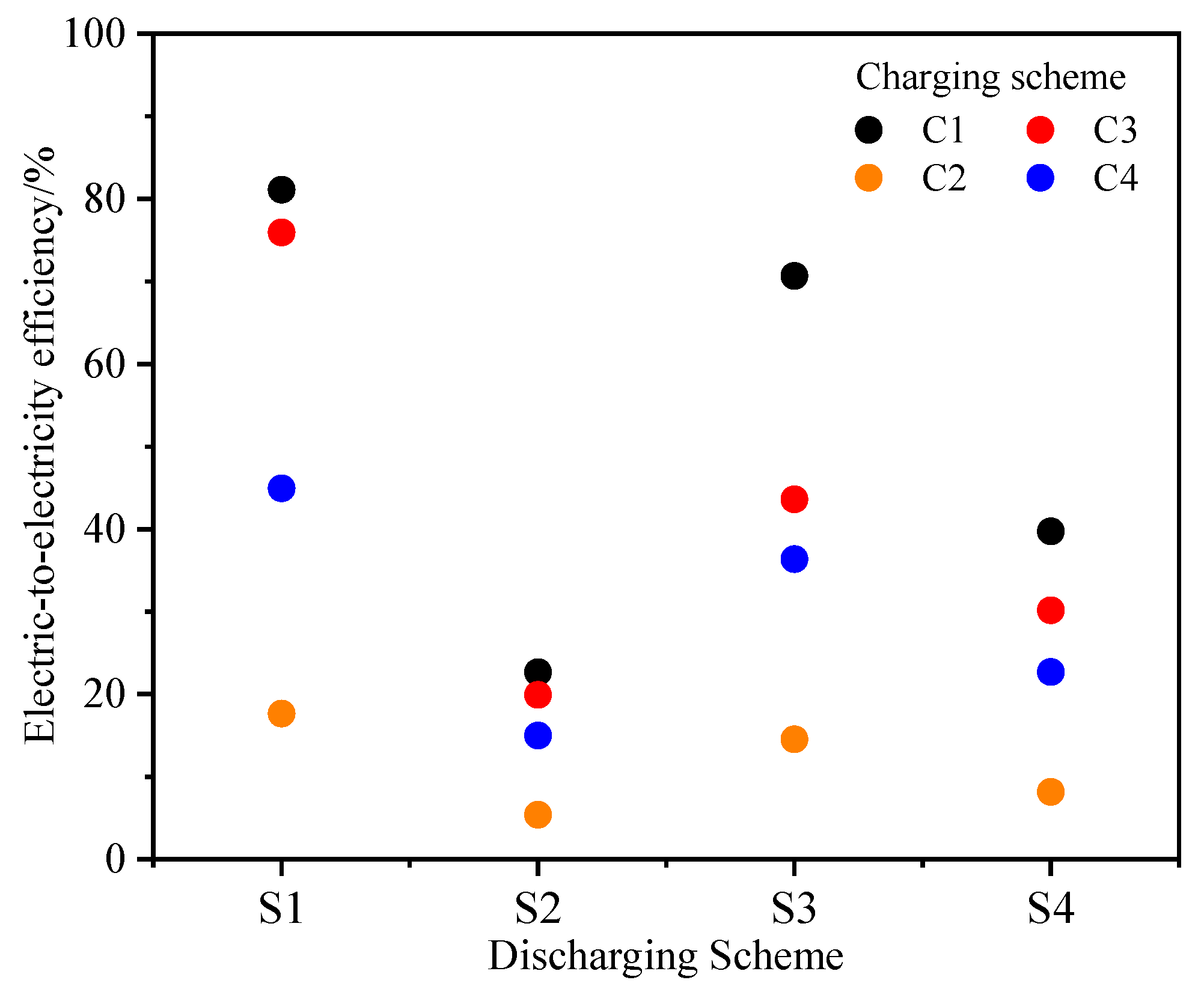 As different schemes involve different equipment configurations, operational strategies, and energy management methods, the round-trip efficiency serves as a unified standard. It enables a more direct comparison of the performance of each scheme, ensuring comparability and consistency. Furthermore, since the primary purpose of an energy storage system is to improve the flexibility and economy of the power system, the round-trip efficiency directly reflects the conversion losses during the storage and reuse of electrical energy. Therefore, for thermal power units integrated with a molten salt storage system, the round-trip efficiency is selected as the fundamental evaluation criterion. A higher efficiency indicates lower energy loss and higher utilization efficiency of the storage system, which contributes to improved economic benefits of the overall system.