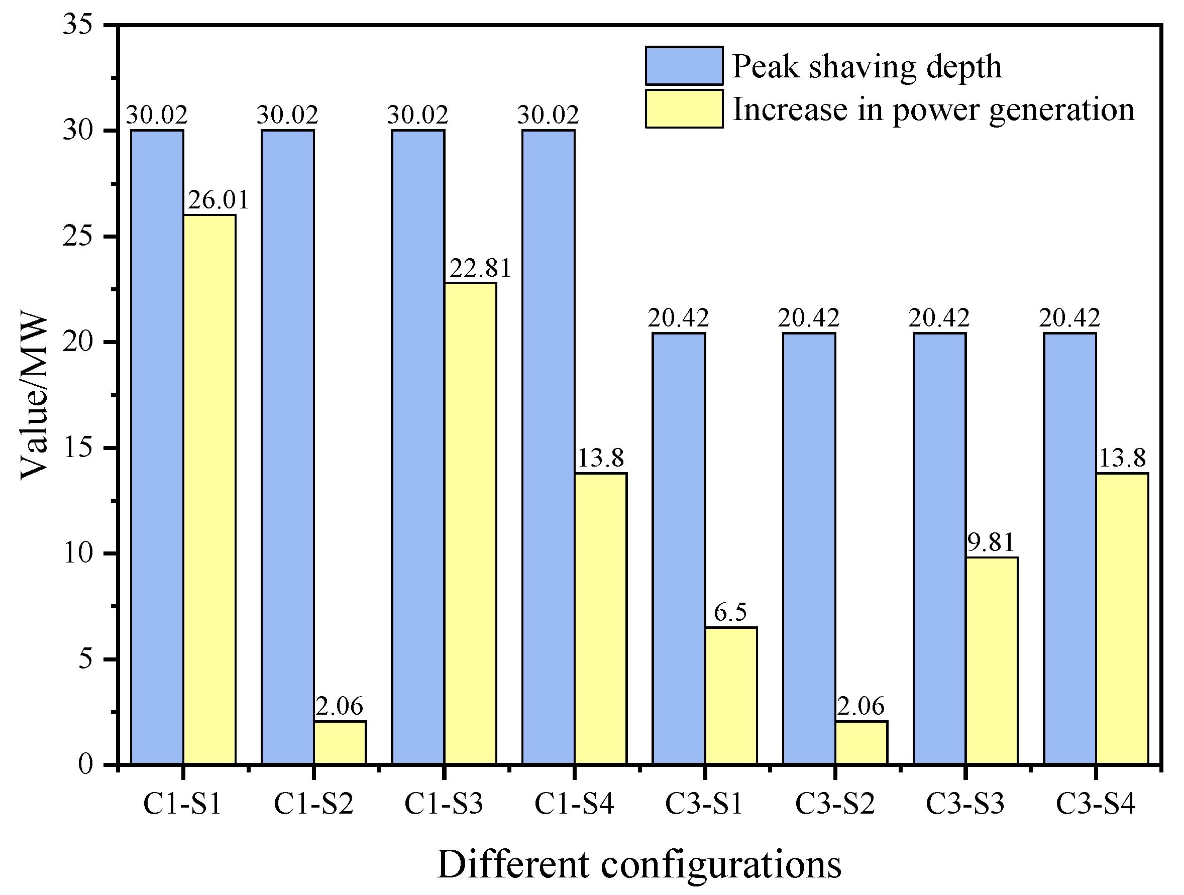 Figure 11. Peak shaving depth and increase in power generation of different combined schemes.
