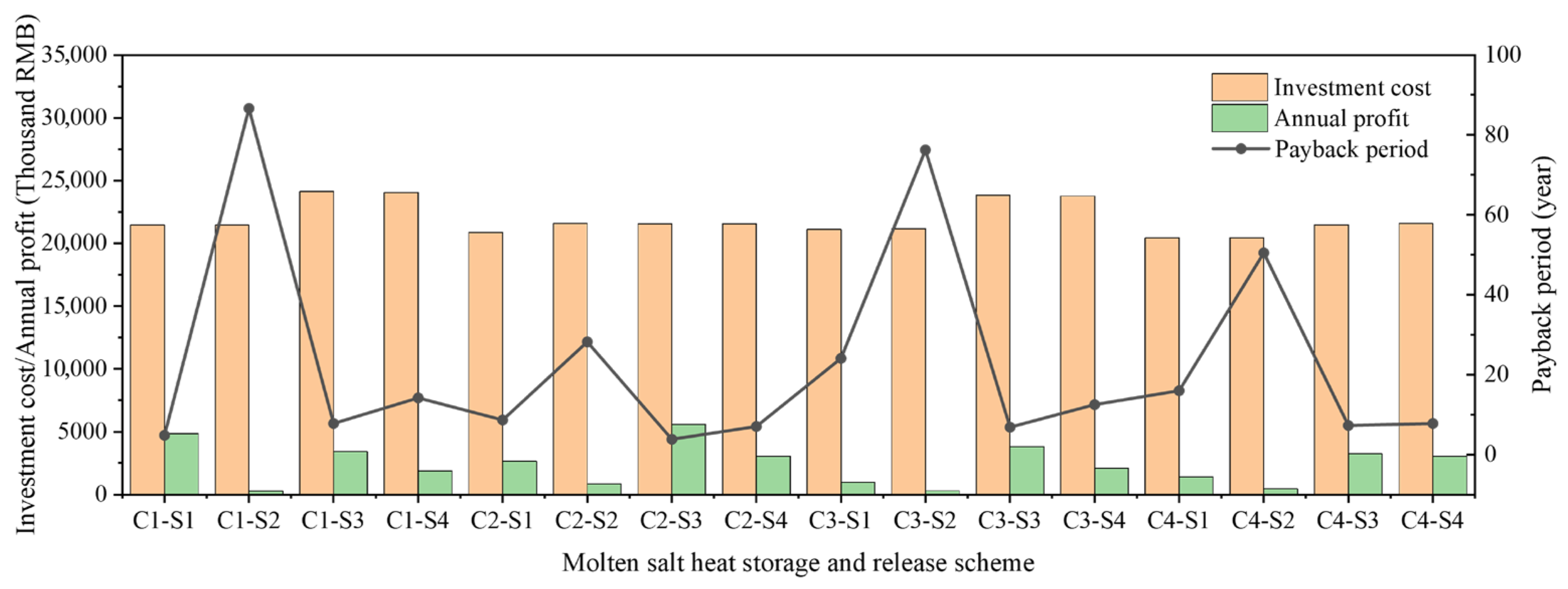 Figure 13. The investment cost, annual profit and payback period of different molten salt energy storage system schemes.