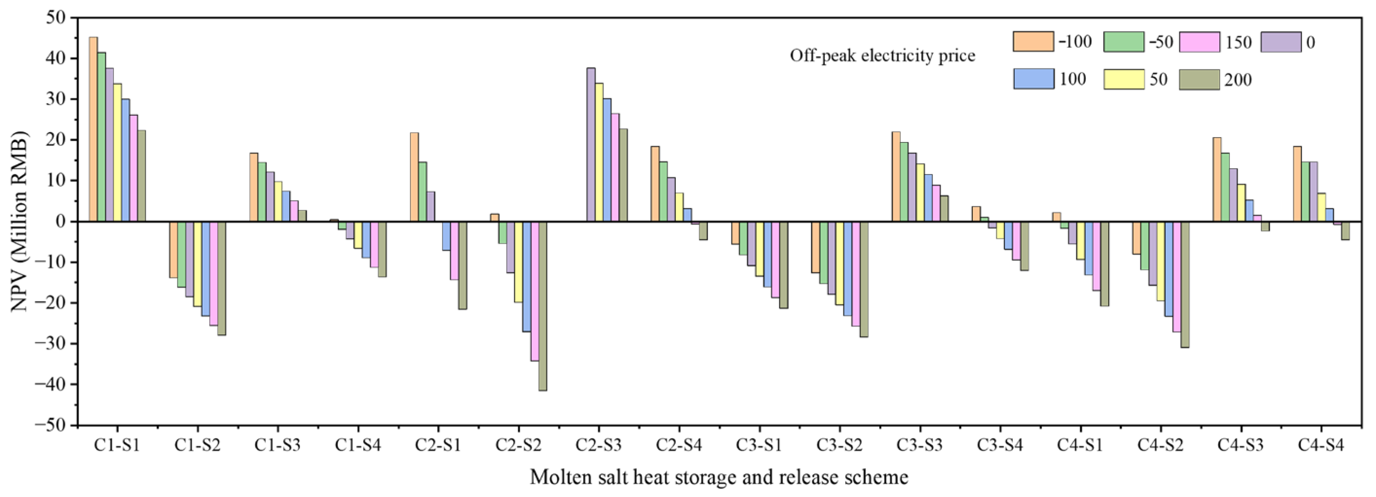 Figure 14. The NPV of different molten salt energy storage system schemes under different off-peak electricity price.