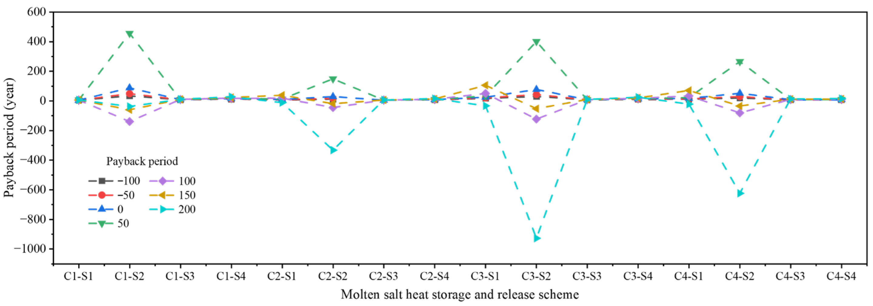 Figure 15. The payback period of different molten salt energy storage system schemes under different off-peak electricity price.