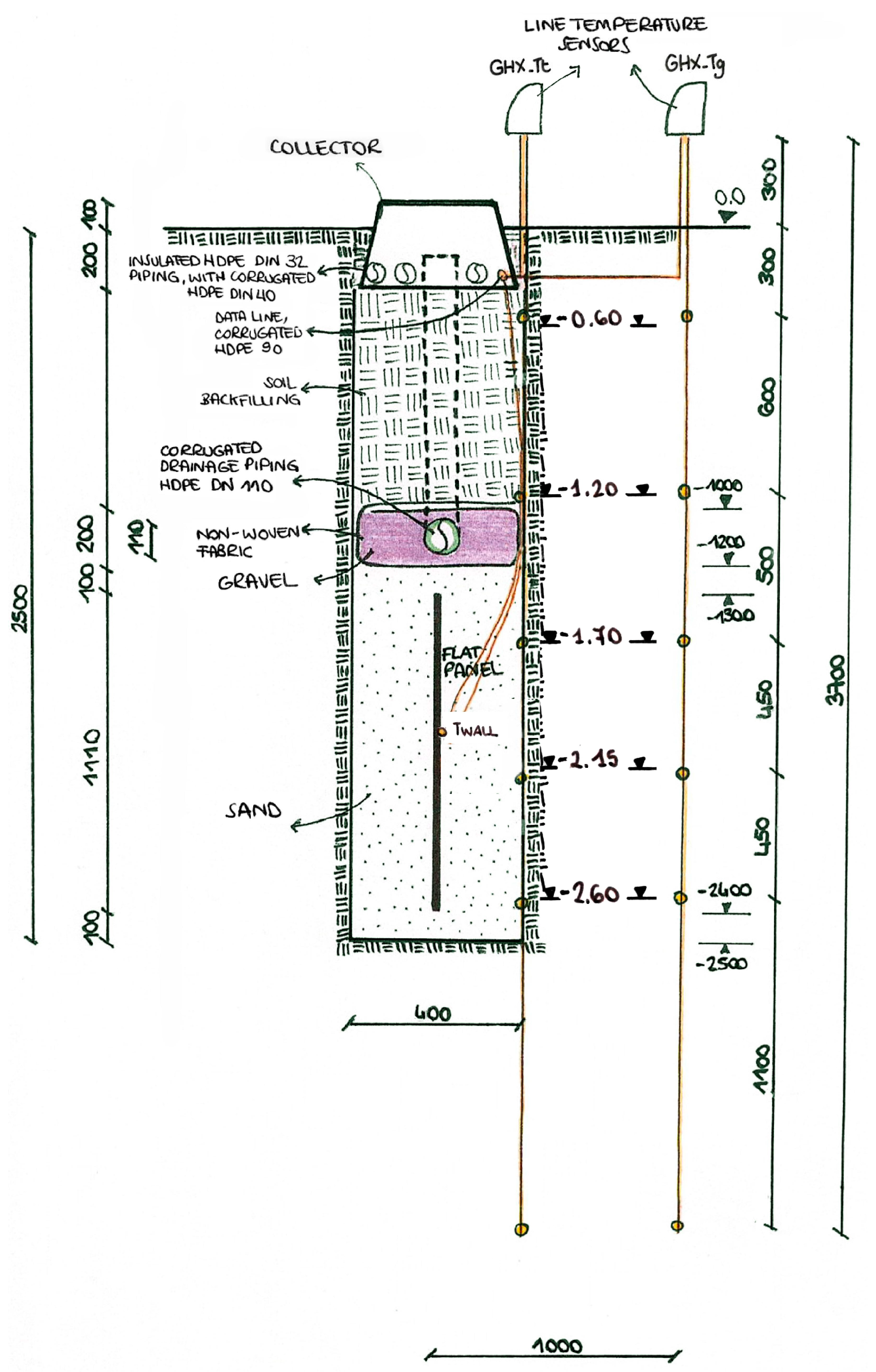 Figure 9). Different backfilling materials were used for the three lines: sand (GHX1), a mixture of sand and paraffin-based granules (GHX2), and cylindrical high-density polyethylene (HDPE) containers filled with hydrated salts (GHX3). A cross-sectional schematic of the FP-HGHE installation in the trench backfilled with sand, reporting the main significant dimensions, is illustrated in