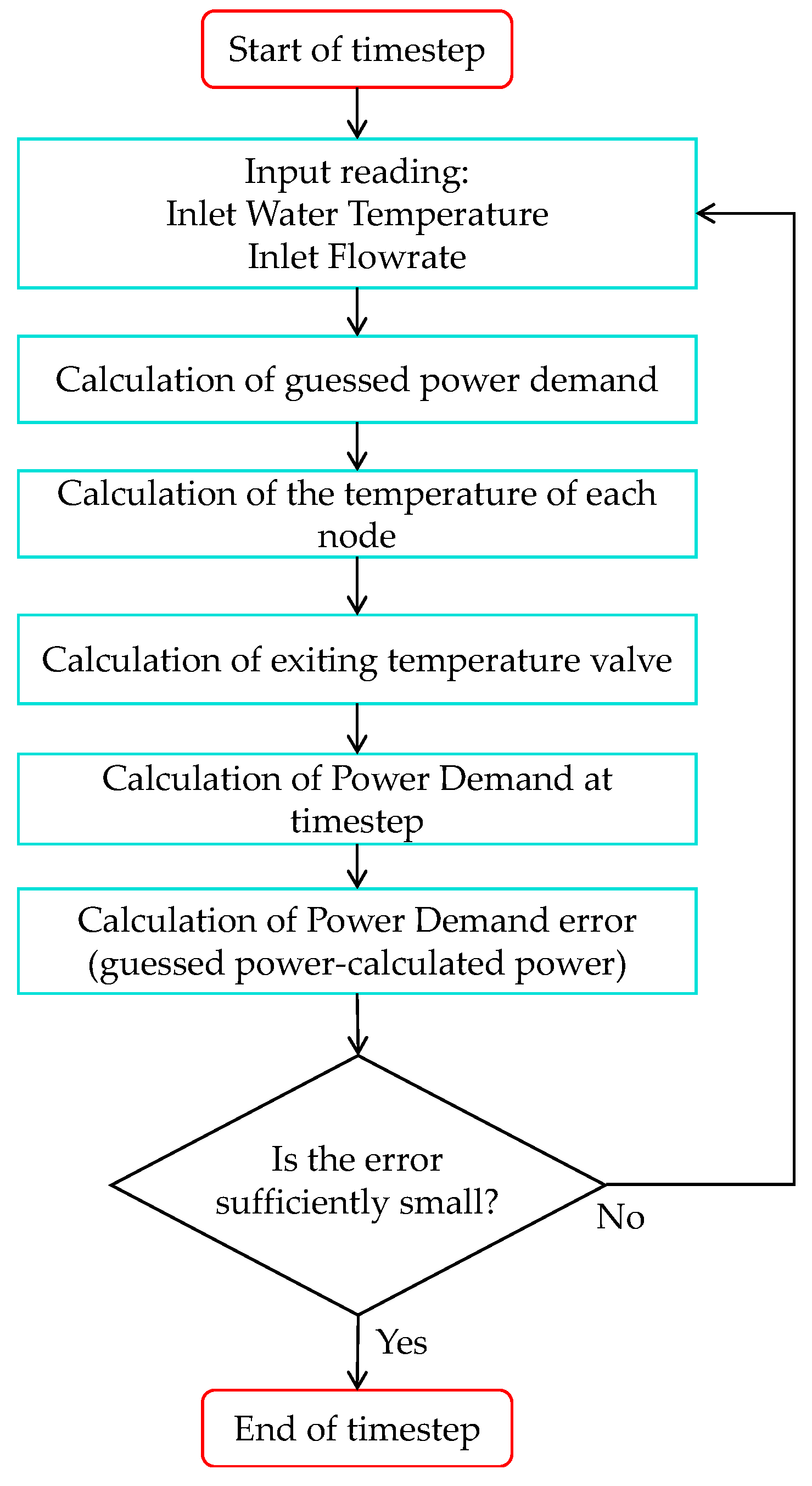 Figure 4. The guess is based on the difference between the outlet temperature from the previous time step and the current inlet temperature. The model then solves for all node temperatures and obtains an updated outlet temperature. Using the current inlet-outlet temperature difference, it computes a revised power demand and evaluates the error between this value and the initial guess. If the error is below a prescribed tolerance, the Type returns the node temperatures to the TRNSYS kernel and the simulation advances; otherwise, the procedure iterates until convergence is reached. The number of iterations per time step is reported among the outputs (output n.5 in
