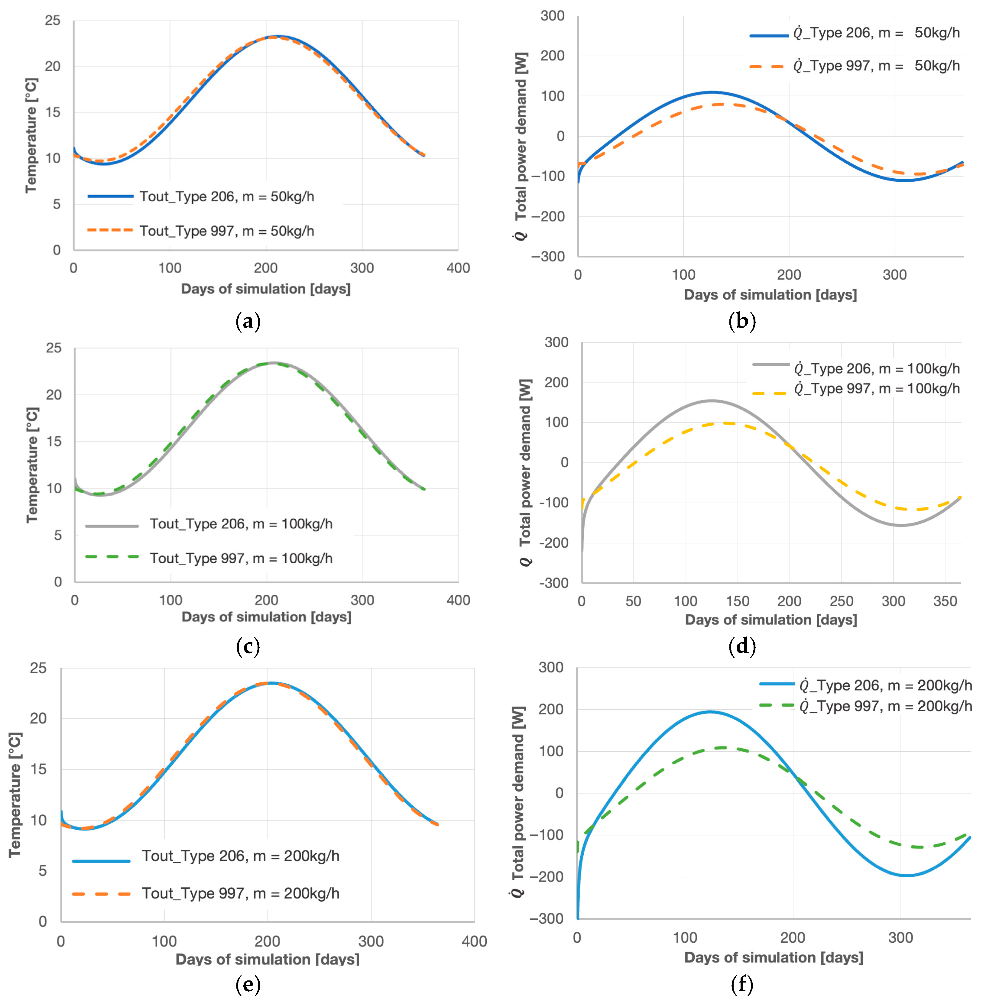 Figure 6b), Type 206 presented a continuity in the value of the outlet liquid temperature, while the same parameter in Type 997 was characterized by a step in the value.