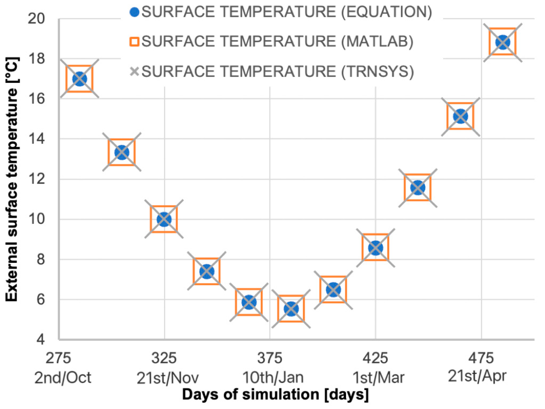 Figure 7 illustrates the values of the external surface temperature as evaluated through Equation (1) of the mathematical model [