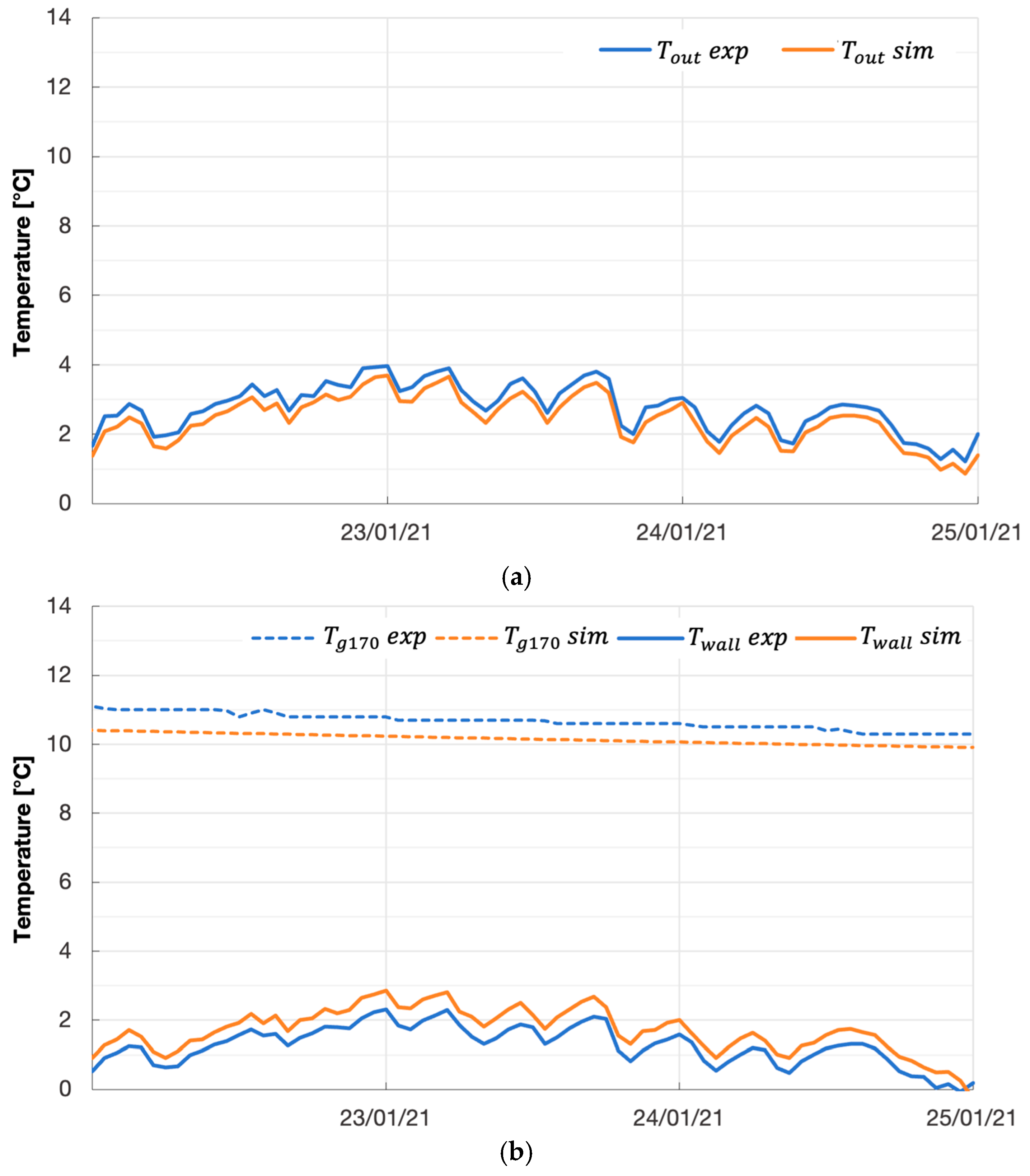 For the comparison, a period of the heating season when only the geothermal line backfilled with sand (GHX1) was operational was considered. Then, the TRNSYS model was configured for case reproduction in terms of layout and operating conditions. The analysis focuses on three representative temperature outputs: the outlet fluid temperature of the geothermal line , the temperature measured at the center of the second FP , i.e., at a depth of 2.00 m, and the temperature measured at a depth of 1.70 m, 1.00 m away from the FP line, .