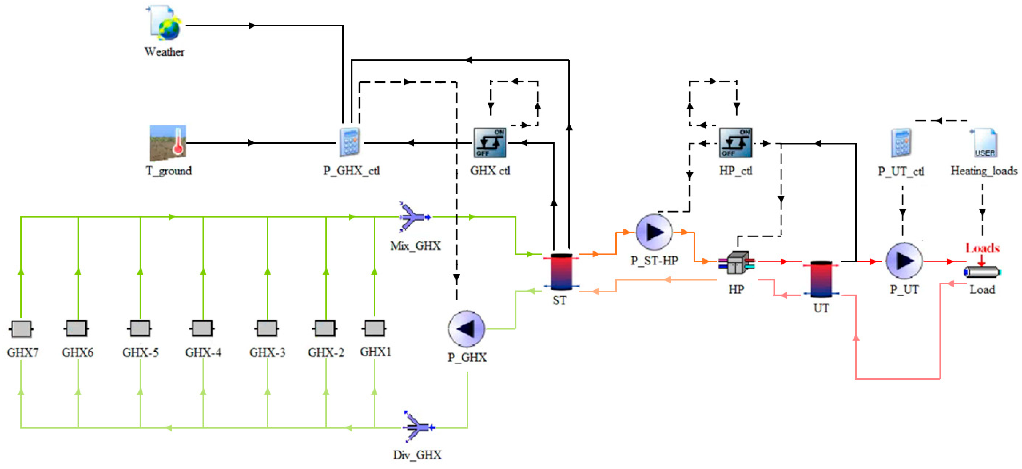 = 9 kW) simulated with Type 927, and of a user loop and a source loop. On the user side, Type 534 was used to simulate the 500 L user tank, which was equipped with 2 ports. One inlet/outlet port was connected with the HP, with a water mass flow rate of 640 kg/h, while a second port was connected with the user pump on the user side, with a load-modulated mass flow rate to provide space heating. Control of the HP operation was carried out via a differential controller with hysteresis (Type 2b), where setpoint temperature of the outlet water on the user side was set equal to 45 °C with an upper and lower dead band temperature of 5 °C and 0 °C, respectively. Accordingly, the HP was turned on whenever the user tank needed to be recharged to the seasonal target temperature. On the source side, the HP was connected with the 500 L source tank equipped with 2 ports as well (Type 534); one inlet/outlet port provided water to the HP through a pump, activated according to the HP. The second inlet/outlet port was connected to the geothermal field. The pump GHX positioned on the outlet port of the source tank provided inlet water to 6 lines of 7 FPs (Type 206) per line in parallel (with a total number of 42 FPs, equal to a total length of 84 m of geothermal line); outlet water was connected to the source tank on the top inlet port. Control of the pump GHX was carried out via a differential controller with hysteresis (Type 2b), where the setpoint of the average water temperature of the source tank (