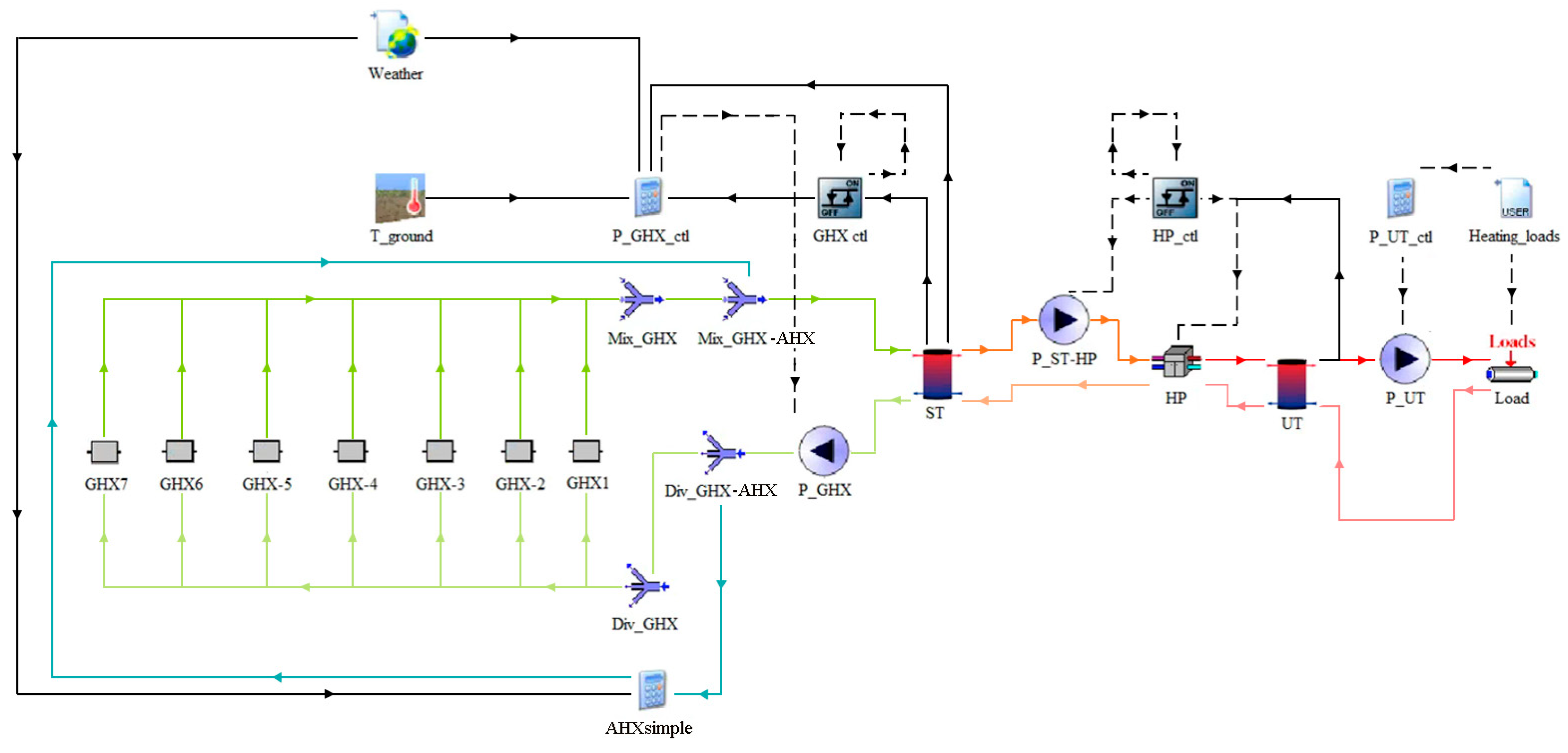 Figure 12) was composed of the same components as the GSHP one, integrated with the possibility to exploit the air source when more favorable conditions than the ground were available. The air heat exchanger (10 kW) was modeled in TRNSYS as a black box governed by a system of equations where the
