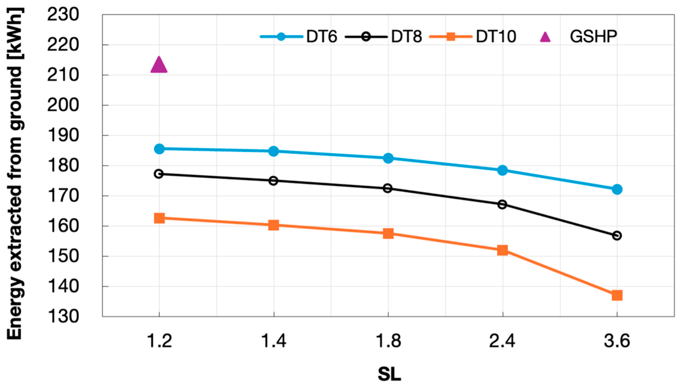 Analysis of the results of the total energy extracted from the ground highlighted that lower values were achieved by higher values of , i.e., by shorter HGHE lines, as is obvious. Furthermore, due to the reduced operating times defined by higher values of , the energy extracted by the same line decreased accordingly.