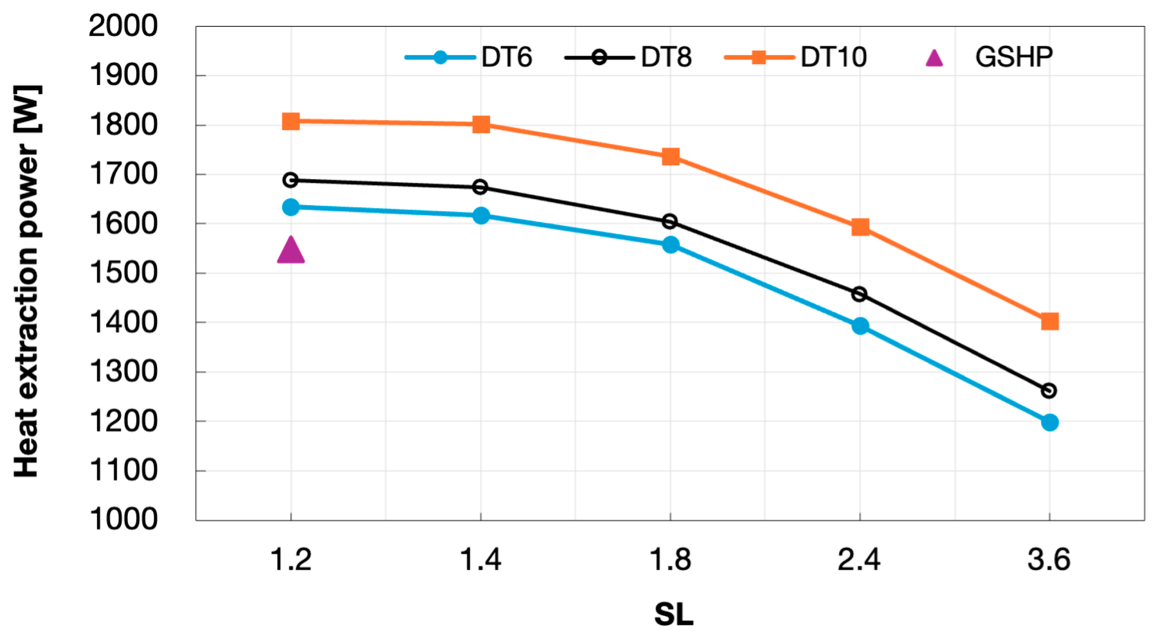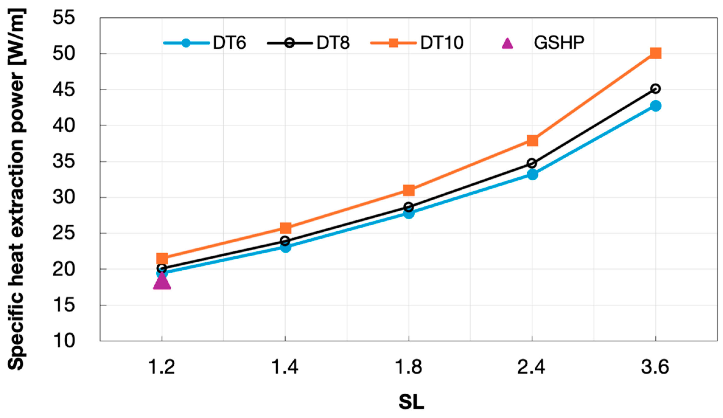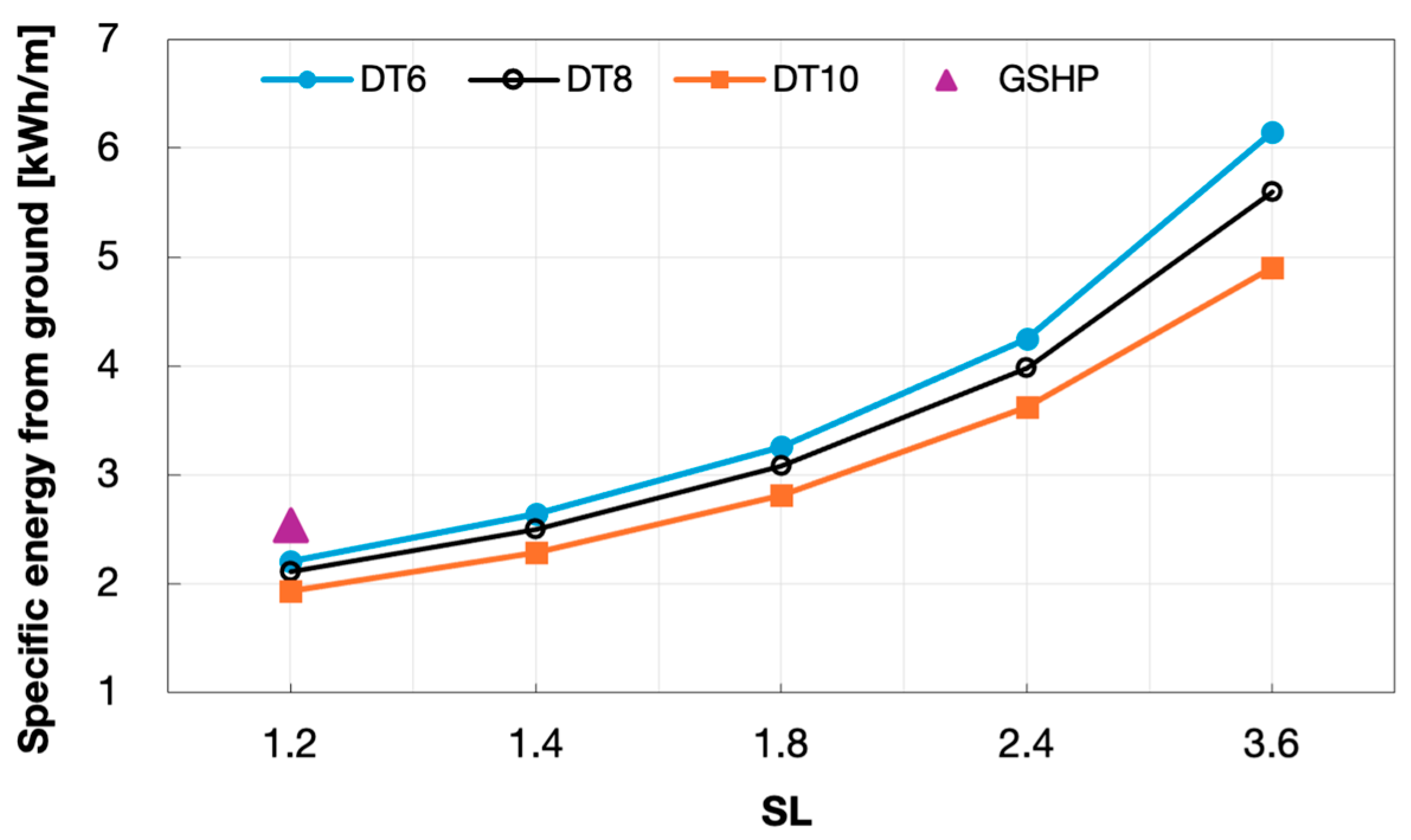 ratio = 3.6. Indeed, the 28 m HGHE line in the DSHP system allowed extraction of a specific power approximately 232%, 245%, and 272% higher than the one achieved with the GSHP reference when adopting an operating strategy with