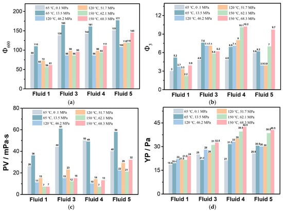 Rheological performances of oil-based drilling fluids 14~16 under HTHP: (a) Φ600; (b) Φ3; (c) PV; (d) YP.