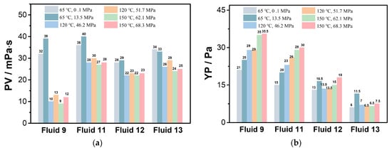 The PV (a) and YP (b) of oil-based drilling fluids 9, 11, 12, and 13 under HTHP.