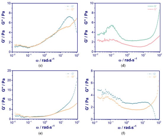 A comparison of Figure 5c,d revealed that during oscillatory sweep tests, the storage modulus G′ of the emulsion treated with DyM-2 exceeded its loss modulus G″ at high oscillation frequencies, while both moduli were nearly identical at medium-to-low frequencies. This finding suggested that the fluid displayed gel-like properties during oscillatory motions of medium to low frequency [31]. Conversely, the G′ of the emulsion containing the thickener invariably exceeded its G″ throughout the entire test. It suggested that the fluid underwent elastic deformation throughout the process, thereby exhibiting half-solid-like characteristics.