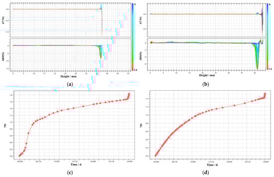 After obtaining drilling fluids with thickening effects at HTHP constructed using the thickener, the suspension stability of the conventional drilling fluid 14 and thickened drilling fluid 15 was tracked and compared following prolonged static storage at both ambient temperature and elevated temperature. Firstly, the sedimentation behavior during static storage for a period of three days at 30 °C was characterized by the monitoring of optical signal changes. As demonstrated in the Figure 6a,b, minimal optical signal variation was observed in the middle and bottom layers of the samples, while both backscatter and transmission signals at the top layer exhibited slight decrease. It was calculated that the backscatter signal of fluid 14 exhibited a decline exceeding 9%, while the transmission signal demonstrated a decrease over 1%. Furthermore, fluid 15 demonstrated a backscatter reduction below 8%, accompanied by a final transmittance decrease of approximately 0.7%. Concurrently, the TSI value of fluid 14 increased substantially, exceeding 1.0 within 12 h and subsequently rising gradually to surpass 1.6. Conversely, the maximum TSI value recorded for fluid 15 did not surpass 1.0 within a 24-hour period, and it maintained a consistent level around 1.4 until the end of the test. It was evident from the comparative results that thickening system 15 exhibited superior suspension stability at room temperature. This finding also suggested that rheological property enhancement played a significant role in improving stability.