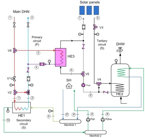 Figure 1 shows the layout of the bidirectional substation in a supply-return configuration. This setup enabled a non-invasive retrofit while preserving the original control logic highlighting in the layout the new components in violet color. The HE1 heat exchanger, located at the interface between the user and the network, transfers thermal power from the primary to the secondary circuit, supplying DHW through the lower coil of the storage tank (HE2) and supporting SH. The solar system is connected to the upper coil of the tank to contribute to DHW production and to an additional heat exchanger (HE3) for feeding surplus thermal energy into the network’s return line. For more detailed information on the control strategies, the reader is invited to refer to [18].
