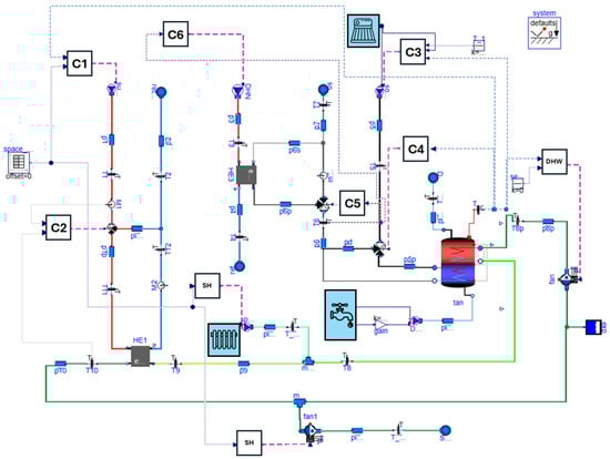 As part of the same study, the dynamic model of the substation was developed to operate throughout the entire year, as shown in Figure 2. The model was mainly built using components from the standard Modelica and IBPSA libraries, along with several custom-developed elements, such as a double-coil storage tank derived from IBPSA models.