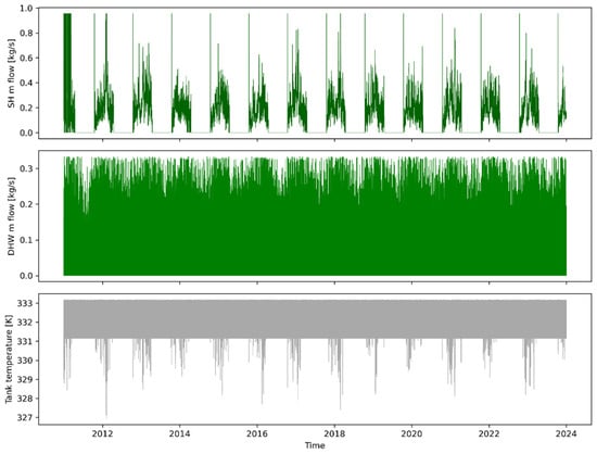 To illustrate the results obtained from the model simulations, two figures are presented showing the temporal evolution of the main variables characterizing the operation of the bidirectional substation. These results, covering the entire 13-year period, were also used as input for the ANN implementation. Specifically, Figure 3 displays three subplots showing, from top to bottom, the hot water flow rate required for SH, the hot water flow rate for DHW, and the temperature of the water in the storage tank. The SH flow rate clearly follows the typical seasonal pattern of the local climate, being active from October 15 to April 15 and zero for the rest of the year. The DHW flow rate maintains a stable daily profile throughout the simulation. Despite regular day-to-day variations, the overall demand pattern, characterized by morning and evening peaks, does not significantly change over the years. Finally, the tank temperature displays a typical set-point controlled pattern, remaining nearly constant at 62 °C (333.15 K) once the desired temperature is reached.