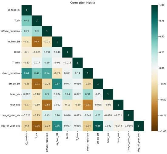To effectively select input variables for training the ANN, the correlation coefficients among the measured quantities were calculated. The results of this analysis are summarized in the correlation matrix shown in Figure 5. The matrix clearly indicates that the target variable, i.e., the thermal power feed into the network (Q_feed-in), is strongly correlated with operational and environmental variables, particularly air temperature, global solar radiation, the mass flow in SH circuit, and the operational status of the SH system (on/off). These correlations were partly expected, given the physical nature of the process, which is strongly influenced by external conditions and solar irradiance. A significant correlation is also observed with cyclic temporal variables, such as hour of the day, day of the year, and month. Their seasonal and daily patterns can be effectively encoded using sine and cosine functions to preserve the cyclical continuity of the variable and improve the training of the ANN. Based on this consideration, only the aforementioned variables that show an absolute correlation coefficient higher than 0.25 have been selected as inputs for the ANN model to enhance its predictive capability and capture the complex dynamics affecting Q. In the cases when sine or cosine of a certain variable do not fulfil the cut-off value of 0.25, both are retained and used as inputs. This value has been chosen based also on previous simulations when it has been observed that adding variables did not lead to improved accuracy.