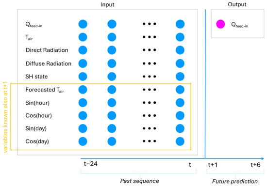 For the prediction of power feed into the DHN, the model inputs were selected by combining historical measurements with forecasted variables. This approach allows the model to leverage both past context and reliable predictive information for the forecast horizon. The historical variables include power feed-in, air temperature, diffuse and direct solar radiation, and the operational state of SH (on/off). In addition, cyclic encodings of the hour and day of the year are included, enabling the model to capture daily and seasonal periodic patterns. Input and output data window are shown in Figure 6.