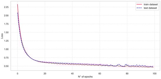 The model was trained for 100 epochs and Figure 7 illustrates the evolution of the loss metric throughout the training process. The results show that the loss function stabilizes, reaching a satisfactory level of stationarity on both the training and test datasets by the end of the 100 epochs, with no evidence of overfitting. Once training is complete, the model is used to generate predictions of the power feed-in, taking the test dataset as input.