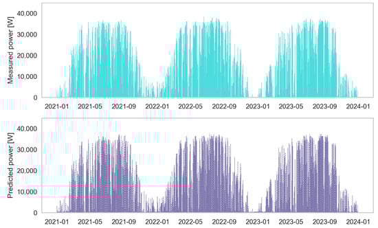 Figure 8 shows the trend of the thermal power feed-in the network by the substation, comparing the values (6 h prediction) obtained from the numerical model (upper plot) with those predicted by the ANN-based model (lower plot) over the period from January 2021 to January 2024. Although the selected time window does not allow a detailed inspection of the model’s accuracy, a good agreement can be observed between the two power profiles, providing preliminary qualitative evidence of the model’s effectiveness in reproducing the original data dynamics.