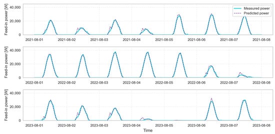 Measured power vs. predicted power: summer weeks.