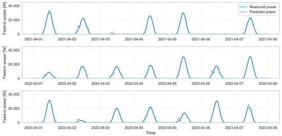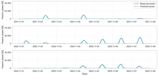 To provide a more detailed evaluation of the model’s predictive capability, Figure 9, Figure 10, Figure 11 and Figure 12 present an in-depth analysis of the thermal power feed-in the network, showing the superimposed simulated and predicted values. The first set of plots, reported in Figure 9, focuses on a summer week between 1 and 8 August, analyzed over three consecutive years. This comparison is particularly useful as it highlights that the ANN does not merely “memorize” the data but is able to generalize effectively across different periods. An excellent level of accuracy can be observed, with the two curves almost completely overlapping. The same analysis was performed for a representative spring week (Figure 10) and autumn week (Figure 11), again confirming the strong consistency between the simulated and predicted data. For the winter period, an additional zoomed-in view is presented in Figure 12 to analyze the system dynamics in greater detail. During this season, as expected, solar production was lower due to reduced irradiation, resulting in a smaller (or even null) amount of thermal energy being fed into the network. This highlights that any discrepancies in the ANN model occur only for very low power values, without compromising the overall quality of the prediction. These low values correspond to periods of high intermittency, due to low levels of solar radiation, which are, however, effectively managed by the substation control and have minimal impact on the overall operation of the system.