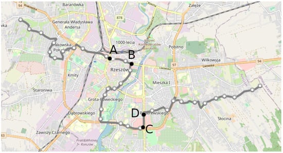 Figure 1 shows selected bus route no. 6 in Rzeszów. Two fragments, A–B and C–D, are marked on this route. Route fragment A–B is located on the main street that runs through the city center. In this fragment there are 2 lanes in both directions. There is also a bus lane in both directions that is active only during morning and afternoon peak. Outside the peak hours it is a normal lane. There are 4 traffic lights in this fragment. Fragment C–D is located on a street that runs outside the city center. In this fragment there are 2 lanes in the C–D direction and 3 lanes in D-C direction. There are 2 traffic lights in this fragment.