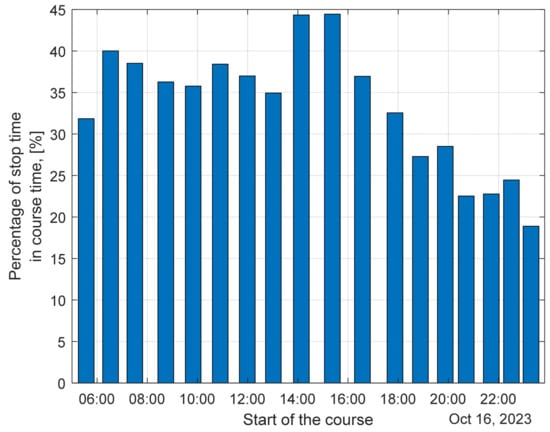 Depending on the time of day and external traffic conditions, the speed profile of the vehicle and the total time of stops during the trip change. These stops result from stops at bus stops and from unplanned stops caused by external traffic conditions. Figure 3 shows the share of stop times in relation to the total duration of the trip. It is based on data for one day of operation of a bus operating on route no. 6. A more detailed analysis can be found in the paper [38]. In the case of peak hours, the sum of stop times reaches approximately 44% of the total duration of the trip.