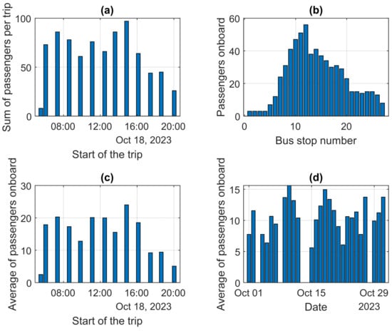 The time of day also affects the number of passengers carried by the bus. To visualize this, Figure 4 was created. Figure 4a shows the sum of passengers on trip carried by the selected 12 m long CNG (Compressed Natural Gas)-powered bus on 18 October 2023 depending on the trip start time. One day was chosen to show the effect of time of the day on the total number of passengers. During the execution of a given trip, the number of passengers on board between bus stops is constantly changing. Figure 4b shows how the number of passengers carried between bus stops changed for one peak-hours trip. This figure was developed for the 15:00 trip on 18 October 2023. This trip was chosen as an example, because during this trip, the bus carried the highest number of passengers during the day, as shown in Figure 4a. To compare the passenger load of each trip on a particular day, the average number of passengers on board the bus was determined. These values were determined from the transport work, defined by the number of passenger-kilometers performed on a given trip or on the entire working day. Transport work is defined as a number of passengers multiplied by distance traveled. Then, this work was divided by the number of kilometers traveled on a given trip or on a given day. Figure 4c shows the average number of bus passengers on board the bus on a selected day in October. Figure 4d shows the average number of bus passengers on board the bus on each day in October 2023.