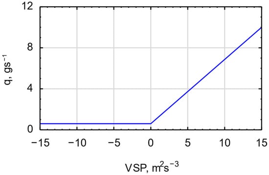 Another important step in the VSP model is the determination of fuel consumption q (gs−1) as a function of the VSP index. For this purpose, the collected data on total fuel consumption on a given route are used. An example of fuel consumption q as a function of the VSP index is shown in Figure 6. The horizontal section of fuel consumption in Figure 6 allows to determine the energy consumed when the bus is stationary. The remaining part of the waveform q = f(VSP) makes it possible to determine the energy consumption required during the bus movement.