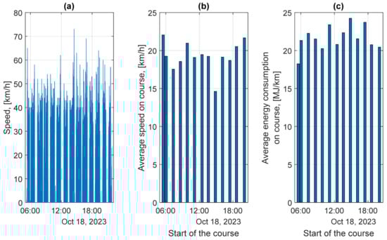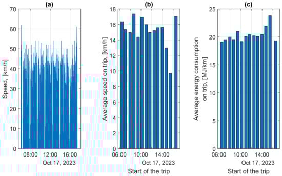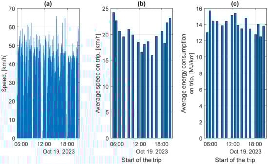 Calculation results for bus no. 810 on 19 October 2023: (a) Profile of instantaneous speed during the analyzed working day; (b) Average speed on each trip; (c) Average energy consumption on each trip.
