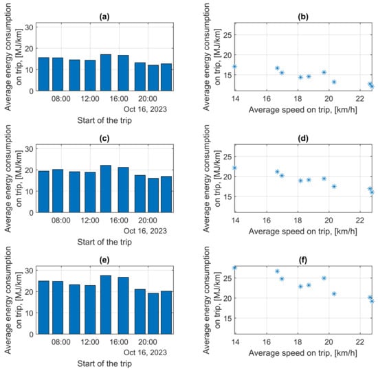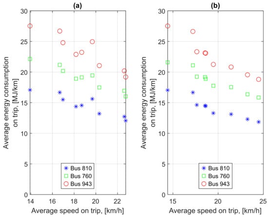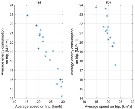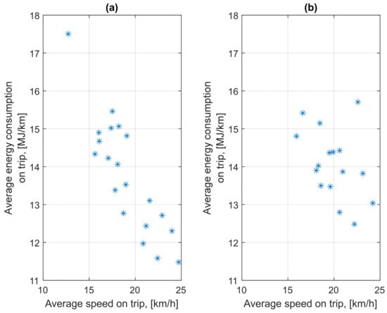 Figure 9 shows the energy consumption per 1 km of the route depending on the average trip speed from two selected days. The bus traveled different routes on the two days considered. On 18 October, the bus operated on the main streets of the city with similar characteristics and traffic volumes. On 19 October, until 17:30, the bus traveled on route no. 10 on secondary downtown streets. After 18:05, the bus traveled on route no. 40 running outside the city center. The characteristics of these routes were different. For this reason, the results shown in Figure 9b are more scattered.