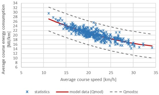 Table 4 shows that a more adequate model for estimating average energy consumption is the Second-degree polynomial model (10) (Figure 10). The sum of the squares of the deviations of the experimental data from the model data under this model is the smallest and is 242.2739. At the same time, the largest absolute error value is max(∆Q) = 2.9887 MJ/km. The polynomial (Qmod3) deviates from the discrete function Qm of the statistical (measured) values of average energy consumption by no more than ε > 0:
