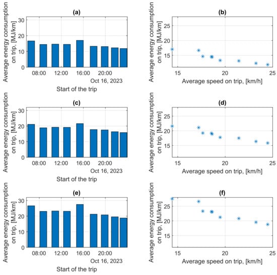 Average energy consumption on the trip in the D–A direction: (a) Average energy consumption on the trip depending on the trip start time for bus no. 810; (b) Average energy consumption on the trip depending on average trip speed for bus no. 810; (c) Average energy consumption on the trip depending on the trip start time for bus no. 760; (d) Average energy consumption on the trip depending on average trip speed for bus no. 760; (e) Average energy consumption on the trip depending on the trip start time for bus no. 943; (f) Average energy consumption on the trip depending on the average trip speed for bus no. 943.