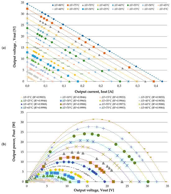 To obtain the characteristic power curves, a variable load circuit, detailed in Figure 3, was used. This circuit allowed for sweeping the TEG’s operation and generating the I-V (a) and P-V (b) curves presented in Figure 4, which are fundamental for the analysis of the maximum power point (MPP).