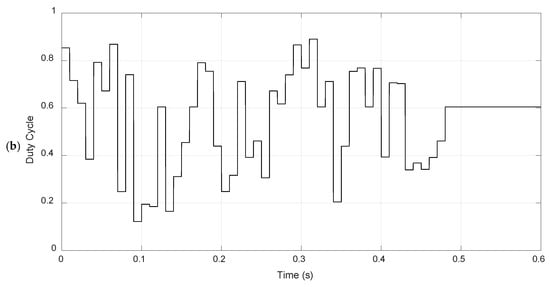 The converter parameters were chosen considering all implemented simulation scenarios, ensuring that the duty cycles corresponding to the GMPPs and LMPPs remained within the 0.1 to 0.9 range. For this, a load resistance of 16 Ω was selected, the input power was determined, and Equations (4) and (5) were used to guarantee the duty cycles within this range. The inductor and capacitor calculations were performed using Equations (6) and (7), respectively.