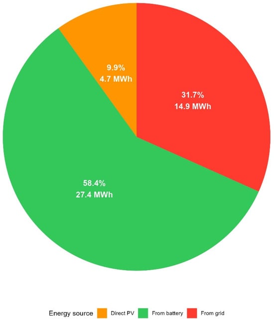As shown in Figure 4, the system achieves a 64.3% reduction in grid imports, primarily because storage enables a substantial shift in daytime PV generation into evening peak consumption. This pattern confirms that self-consumption, not gross PV yield, is the main determinant of economic performance under net-billing. The figure also indicates that inverter and storage losses constitute the majority of residual grid dependency, which limits further efficiency gains even when PV capacity is increased.