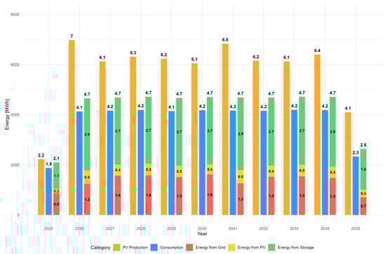 Annual energy balance (MWh). Source: simulation results (2025–2035).