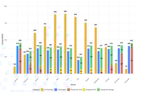 Energy production surpluses, as illustrated in Figure 6 (the difference between PV generation and total energy supplied from PV, storage and grid), are observed from March to September. This seasonal asymmetry drives the system’s marginal profitability, as utilization is concentrated in spring–summer while winter operation relies almost entirely on grid imports. In months with low irradiance (November–January), PV-BESS contribution is minimal, with December showing the strongest dependence on the grid.