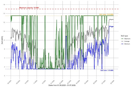 The simulation utilized several key parameters to define the state and flow trajectory, including: storage capacity in kWh (tested at 5, 10, and 15 kWh), minimum and maximum allowable state of charge as fractions of capacity (ranging from 10% to 90% of storage capacity), storage cycle efficiency, DC/AC inverter efficiency, constant inverter idle power consumption, calculation interval length, maximum allowable charging energy based on current and voltage constraints, PV production scaling factor (number of PV panels ranging from 7 to 14), an algorithm for aligning reference years of production with years of consumption, and the initialization condition of the storage state. The integration of a deterministic feed-in sequence with precise loss accounting establishes a replicable and physically consistent model of PV-BESS system operation at a fifteen-minute resolution. This model is prepared for the analysis of self-consumption efficiency, grid energy reduction, and inverter load across diverse input conditions. This establishes an objective framework for comparing system configurations, evaluating the effects of alterations in technical parameters and input data quality, and developing operational metrics for optimization and investment planning.