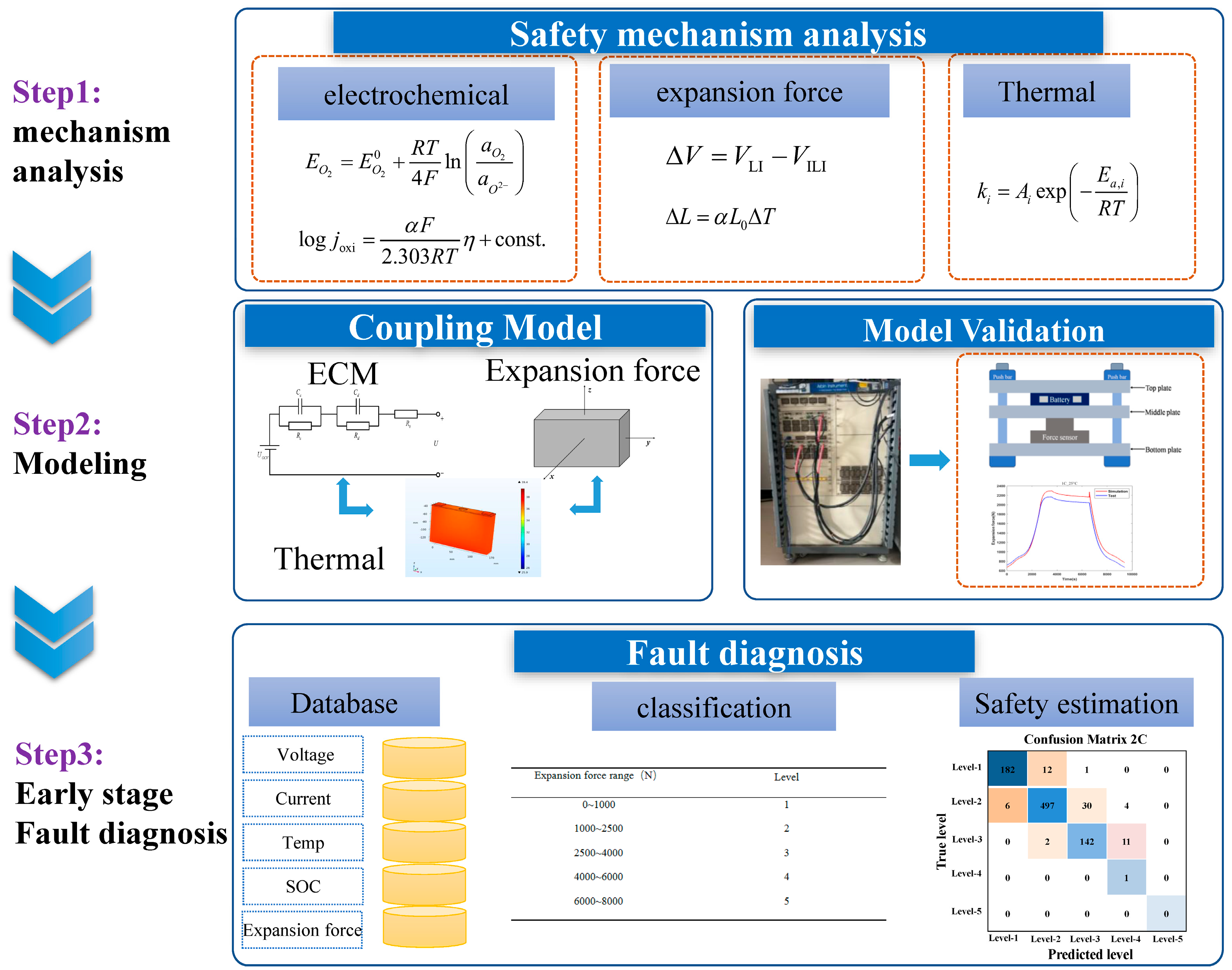 - The multi-dimensional data such as expansion force, temperature, voltage, current, and SOC are established to build the database, and a safety classification method based on the expansion force is proposed. The method is used to classify the safety level of the expansion force and realize the early warning of battery safety.