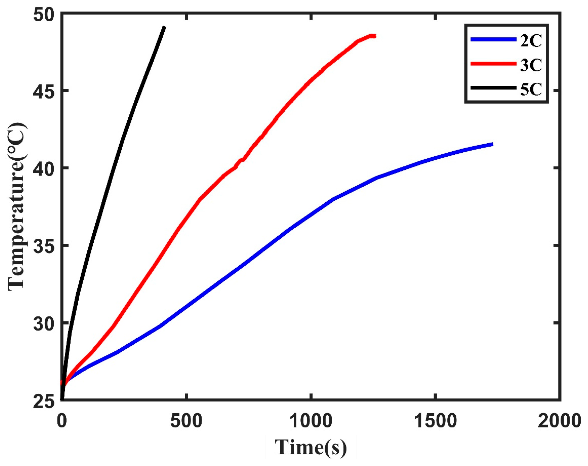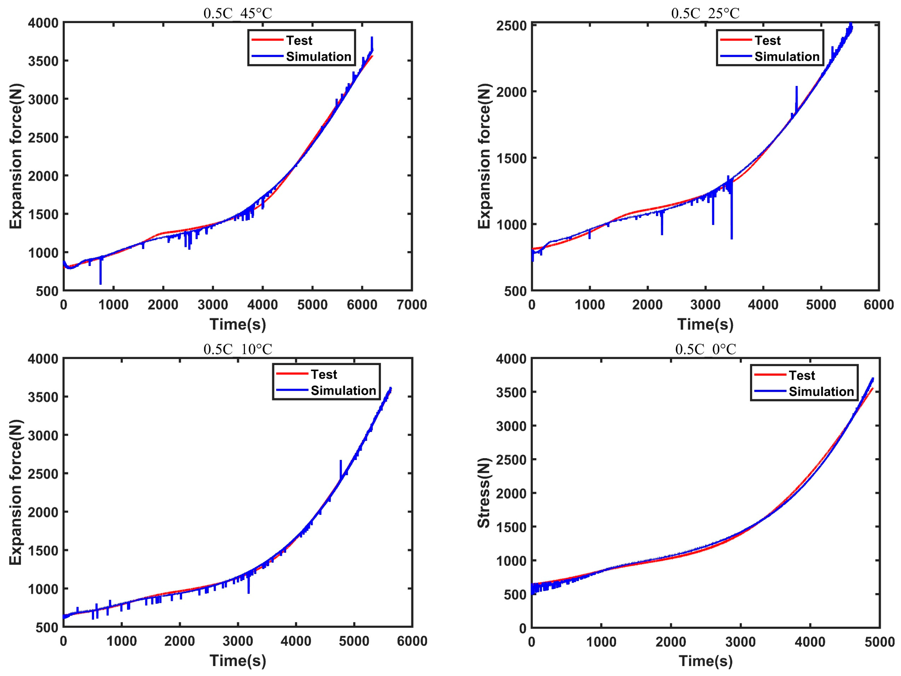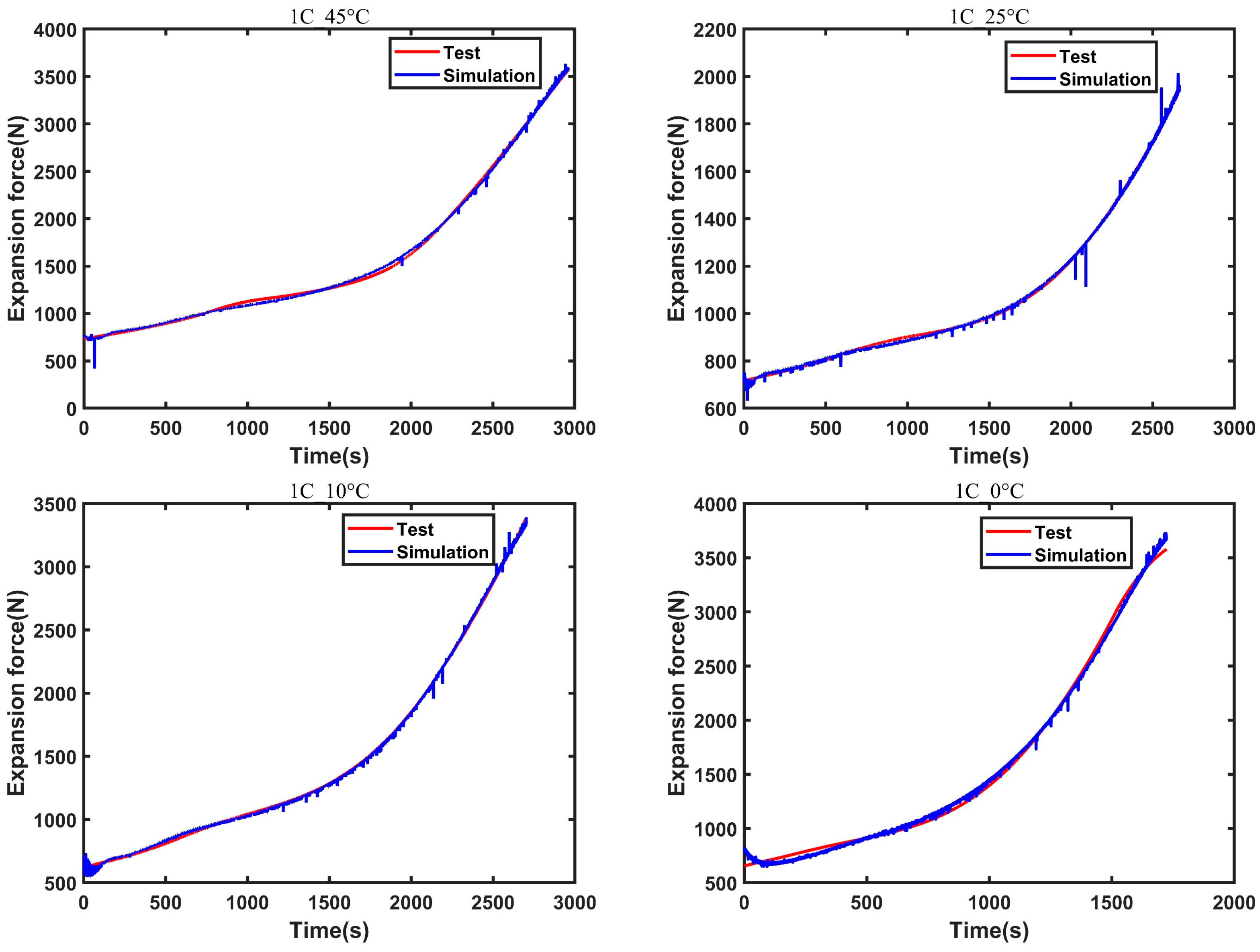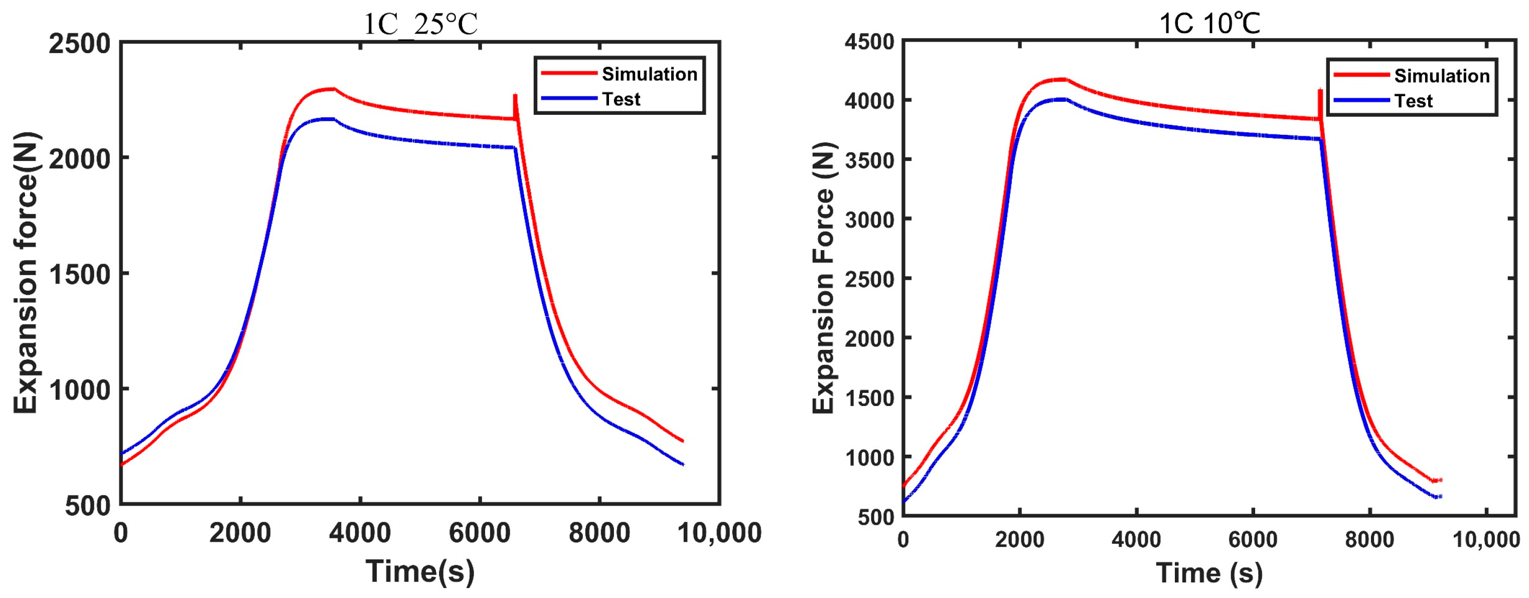 - The study established an electrical–thermal–mechanical coupling model for lithium-ion battery cells. Based on the model, simulation tests were conducted near the safety boundary conditions to achieve high rate charging scenarios, and the evolution mechanism between surface temperature, expansion force, and charge–discharge rate was revealed from the simulation level.