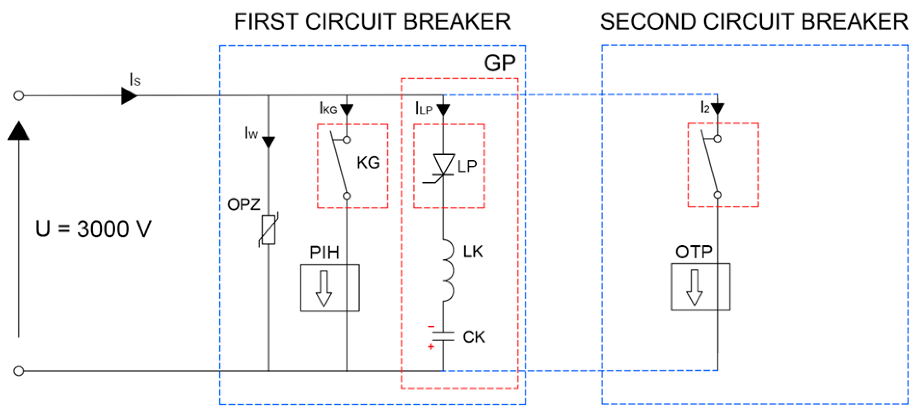 In FCM-based CBs, the interruption is achieved by generating an oppositely directed current pulse, referred to as the CC. Its source is a series-connected inductor LK and commutation capacitor CK. The CC circuit is activated by a semiconductor device LP, which, together with LK and CK, forms the CC generator GP. The switching unit KG, equipped with a vacuum interrupter, is responsible for closing and opening the main circuit. Proper synchronization of KG and LP is a necessary condition for correct CB operation.