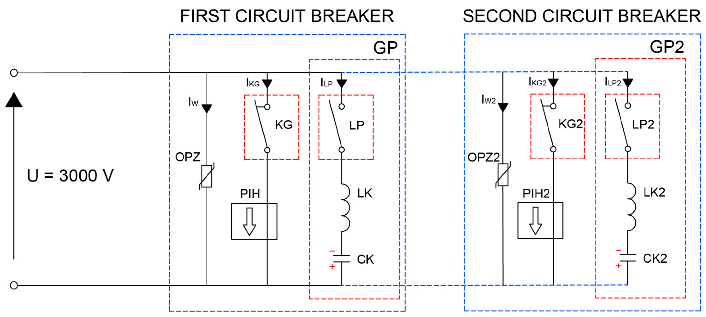 15]. A parallel connection of this type of CB with another identical one, and with a conventional magnetic blow-out CB, was investigated. Previous studies only addressed isolated breaker operation, whereas the present work introduces and validates a coordinated parallel configuration of hybrid FCM-based DC breakers, identifying counter-current interaction limits, optimal commutation parameters, and experimental thresholds for non-intrusive sensor response. Each device was assumed to operate independently, necessitating the integration of two current sensors, one per breaker. This paper analyzes the GP counter-current circuit to investigate how inductance LK and capacitance CK affect the shape, duration, and amplitude of the counter-current half-wave. The study identifies the optimal resonant frequency for the GP to prevent the spontaneous opening of circuit breakers during parallel operation, specifically in forced-commutation systems.