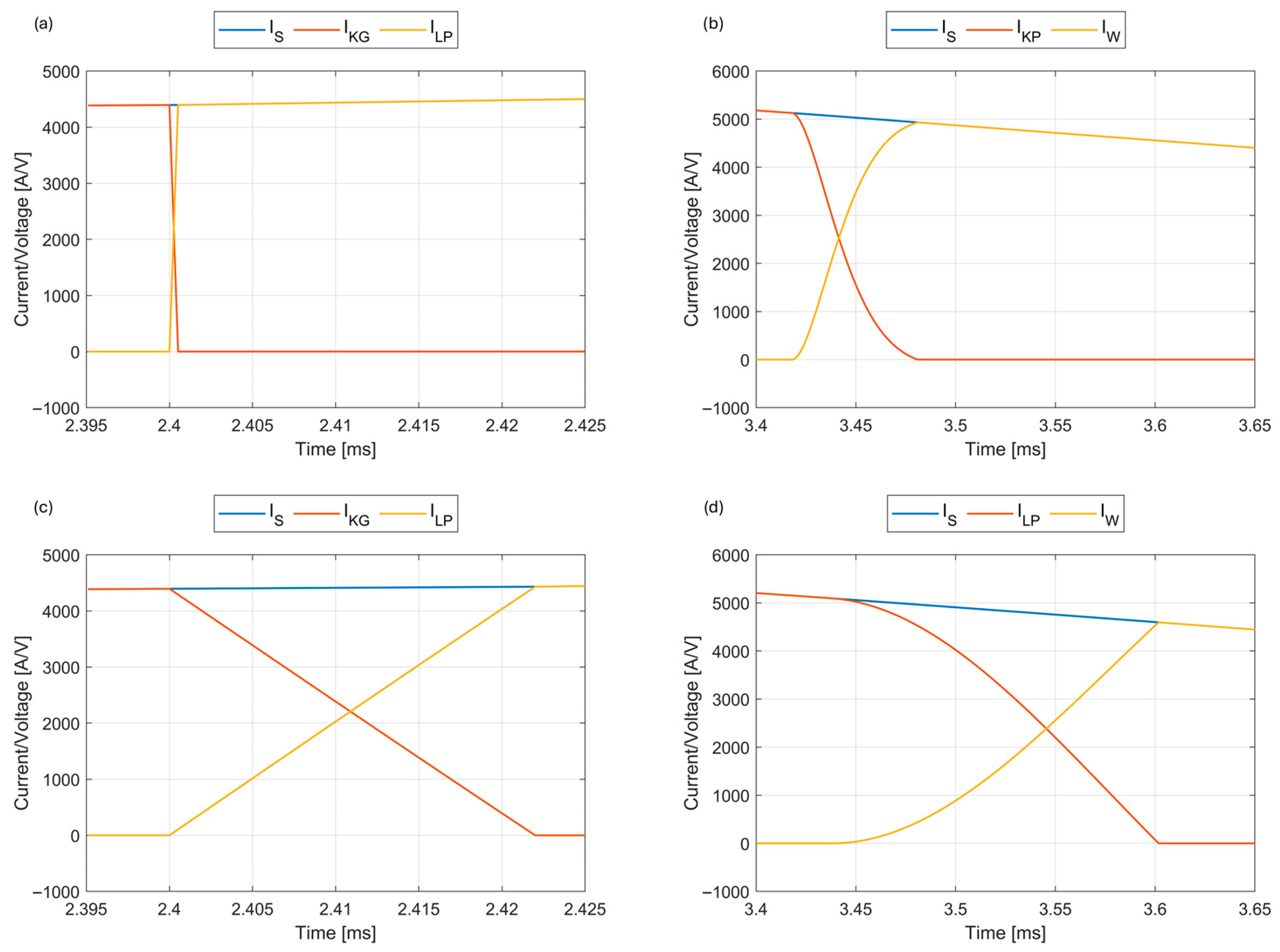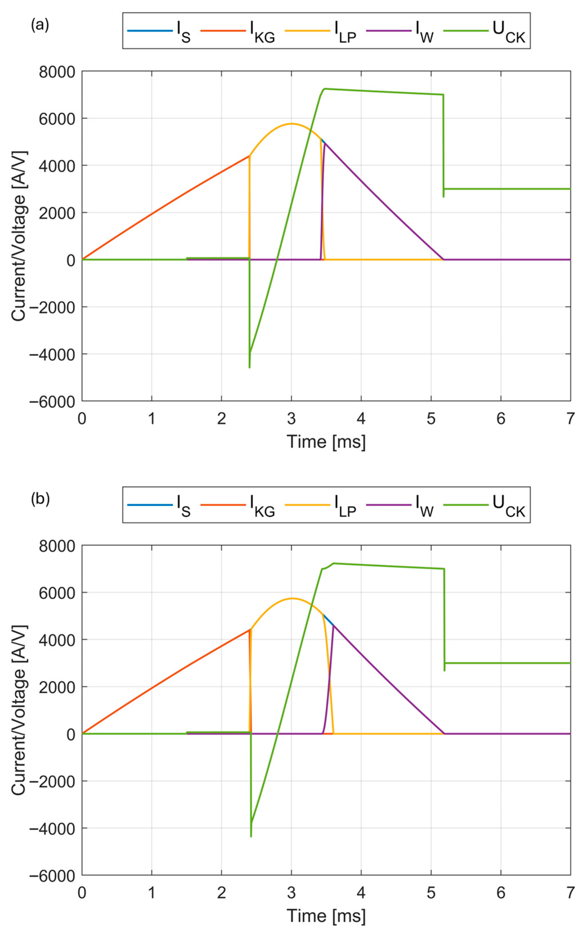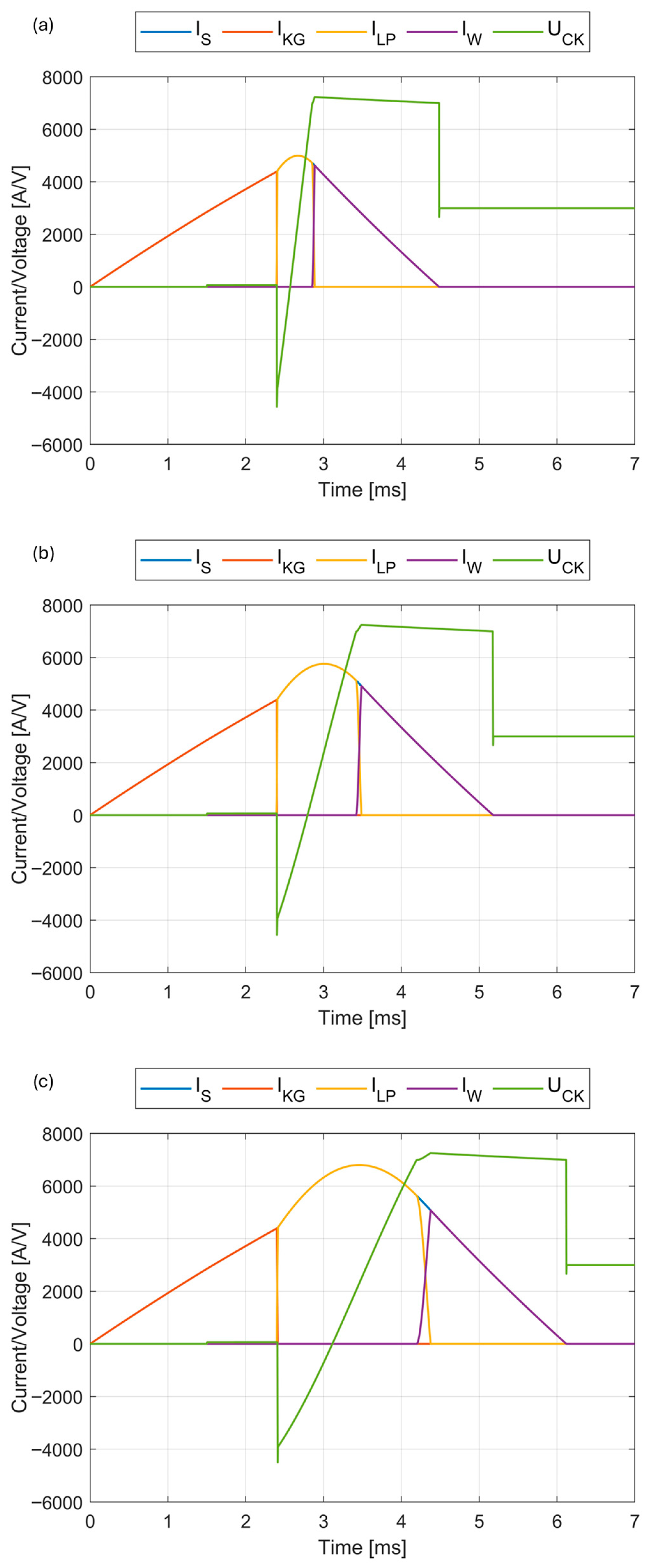 exp = 30 kA. Comparing the results with each other, the GP conduction times are different and equal to approximately 500 µs, 1 ms, and 2 ms. The current amplitude I