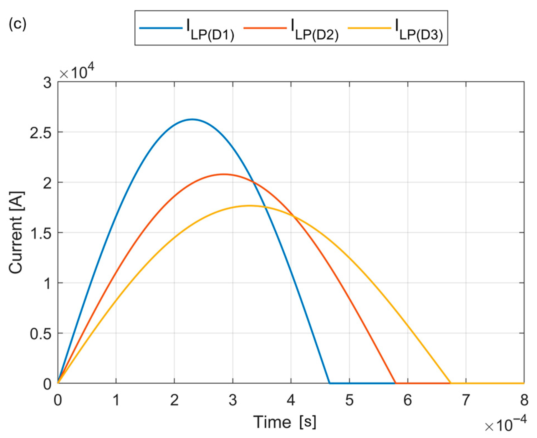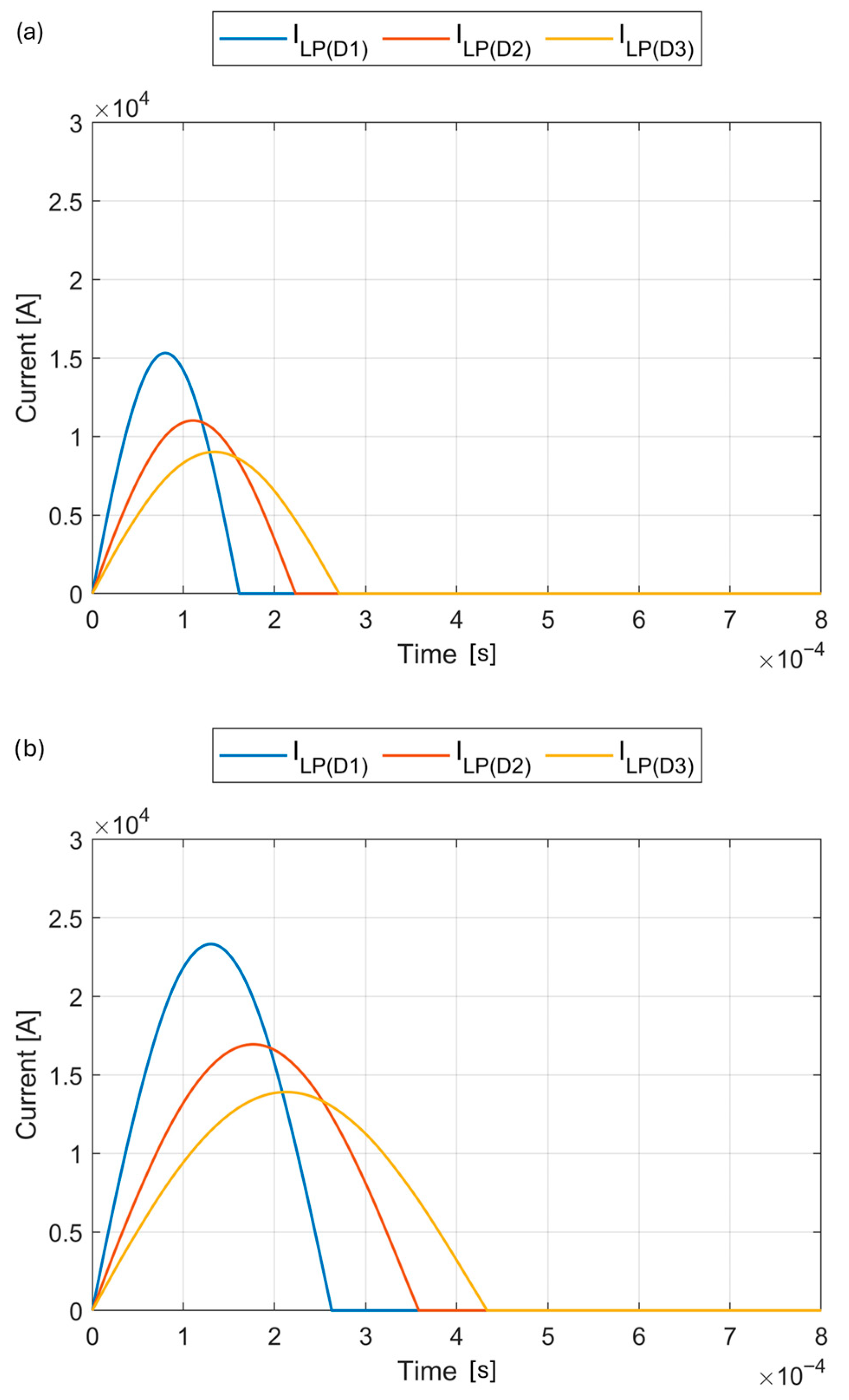 For the CB with a GP frequency of f = 10.2 kHz, ILP reaches approximately 15 kA with a duration of only 1.6 ms for case D1. After increasing Rp and Lp, the amplitude dropped below 10 kA and the duration extended to 3 ms.