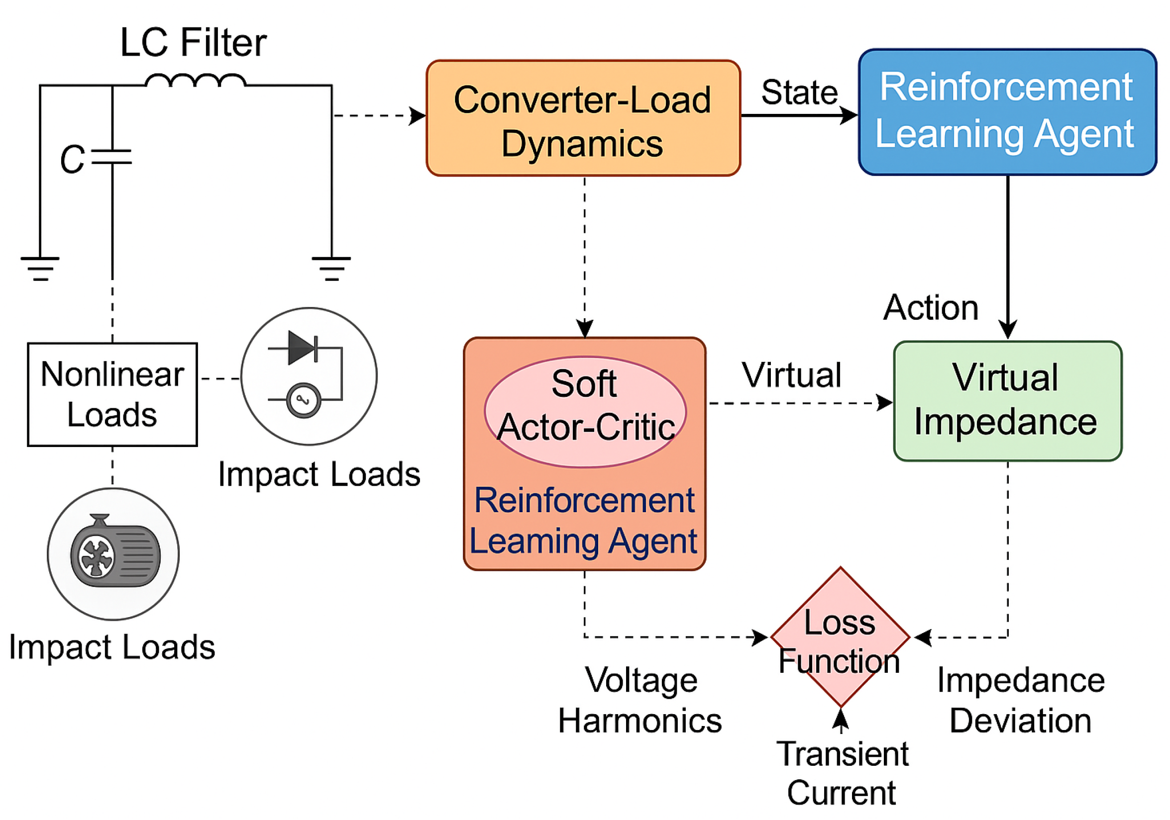 Figure 1 illustrates the closed-loop architecture where a Soft Actor-Critic reinforcement learning agent adaptively adjusts virtual impedance in response to converter-load dynamics under nonlinear and impact loads, optimizing power quality and transient resilience through real-time feedback.