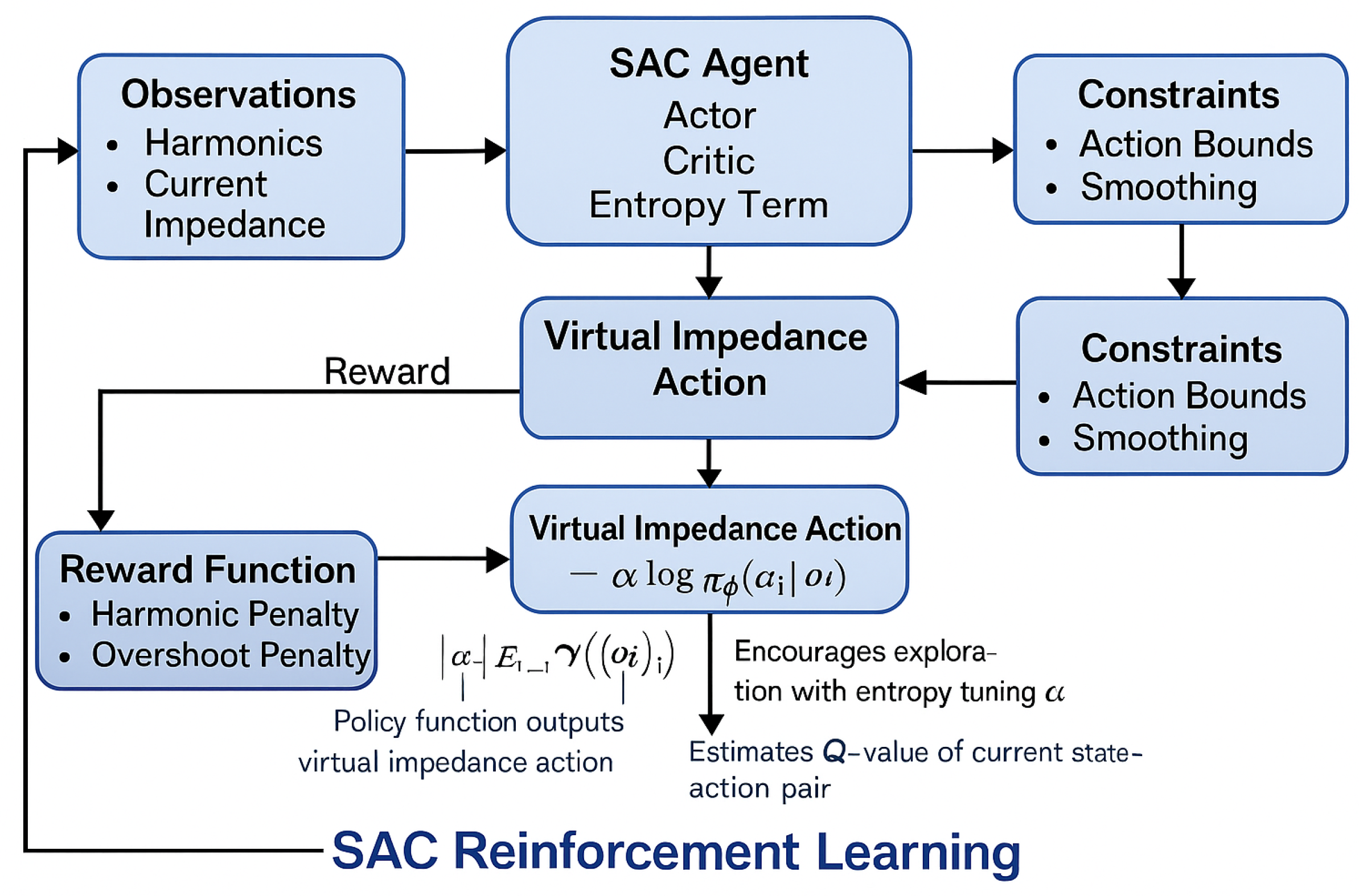 The core objective of this work is to develop an adaptive control strategy that enables a grid-forming converter to intelligently regulate its virtual impedance in real time under uncertain, high-distortion operating conditions. This section presents the reinforcement learning-based control framework that achieves this goal by treating the virtual impedance tensor—comprising dynamically adjustable resistive, inductive, and capacitive components—as a continuous control action. Unlike traditional rule-based or offline-tuned impedance methods, our approach leverages a stochastic policy trained via deep reinforcement learning to map observed electrical features to optimal impedance profiles. The method is formulated as a continuous-state, continuous-action Markov Decision Process (MDP), where the converter and its surrounding environment (including nonlinear and impulsive loads) constitute the dynamics, and the agent acts through impedance shaping at each control interval. To enable effective policy learning, we design a structured observation space incorporating key time-domain and frequency-domain features, such as voltage harmonic content, output current gradients, and historical impedance settings. The action space is represented by a set of normalized impedance parameters constrained by physical feasibility and stability considerations. The reinforcement learning algorithm is based on the Soft Actor-Critic (SAC) framework, chosen for its ability to handle multi-objective, continuous-action tasks while maintaining stochastic exploration through entropy regularization. Within this framework, the agent is trained to maximize a composite reward signal that penalizes voltage total harmonic distortion (THD), transient current overshoot, and unnecessary impedance fluctuation. The remainder of this section provides a complete formulation of the MDP, details of the SAC training pipeline, and mathematical descriptions of the impedance policy, reward functions, and constraint enforcement mechanisms.